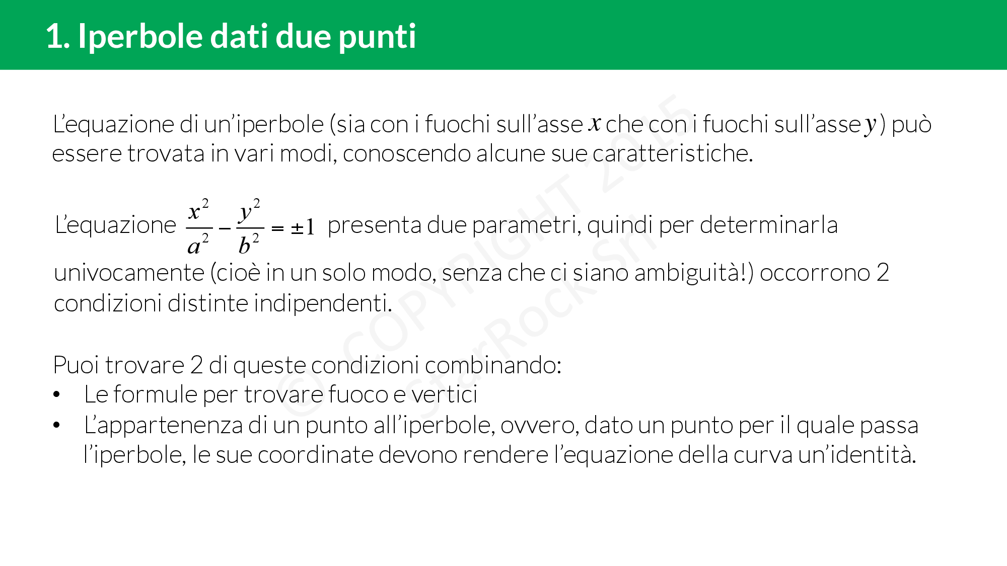 L’equazione dell’iperbole ha la forma £$\frac{x^2}{a^2}-\frac{y^2}{b^2}=\pm 1$£. Ci sono 2 parametri £$a^2$£ e £$b^2$£, quindi, per determinarla univocamente (cioè senza ambiguità), servono due condizioni distinte e indipendenti.