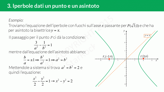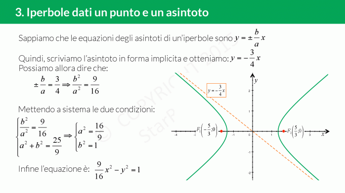 Potrebbe capitarci di dover determinare l’equazione dell’iperbole conosciuti un punto (vertice, fuoco, punto appartenente all’iperbole) e un asintoto dell’iperbole.