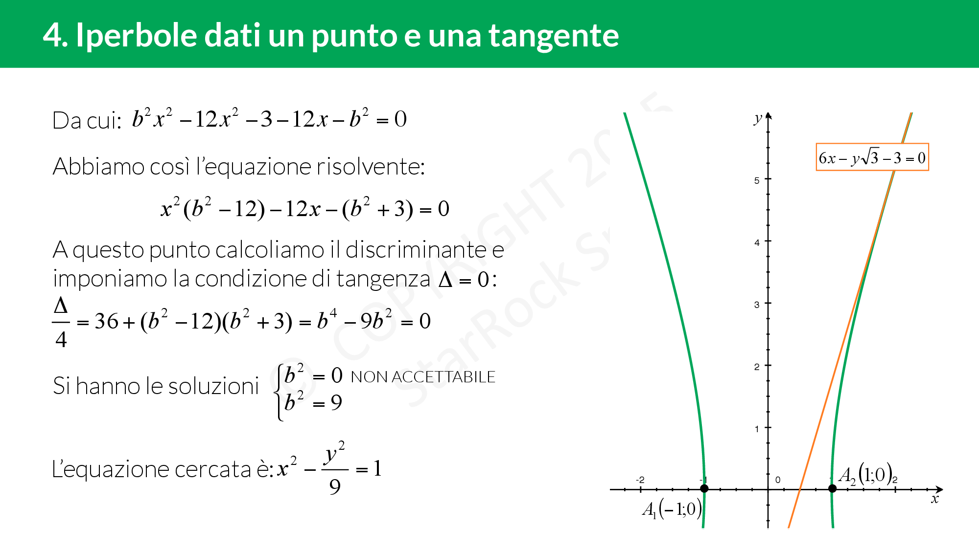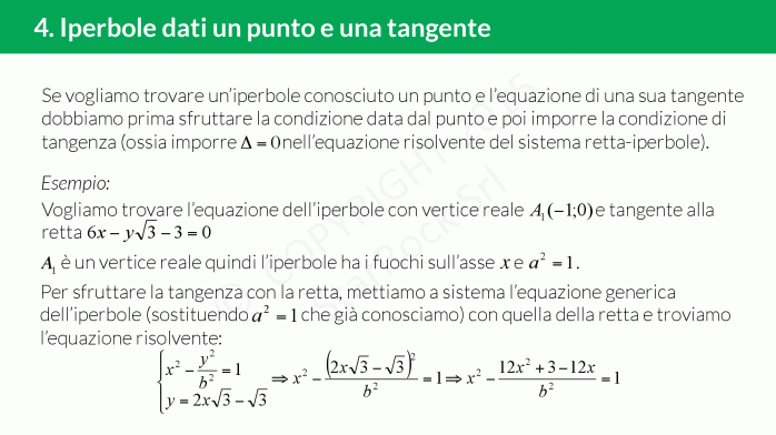 Se vogliamo trovare l’equazione di un’iperbole conosciuto un punto e l’equazione di una sua tangente dobbiamo prima sfruttare la condizione data dal punto e poi imporre la condizione di tangenza, cioè imporre che sia uguale a zero il delta dell’equazione risolvente il sistema retta-iperbole.