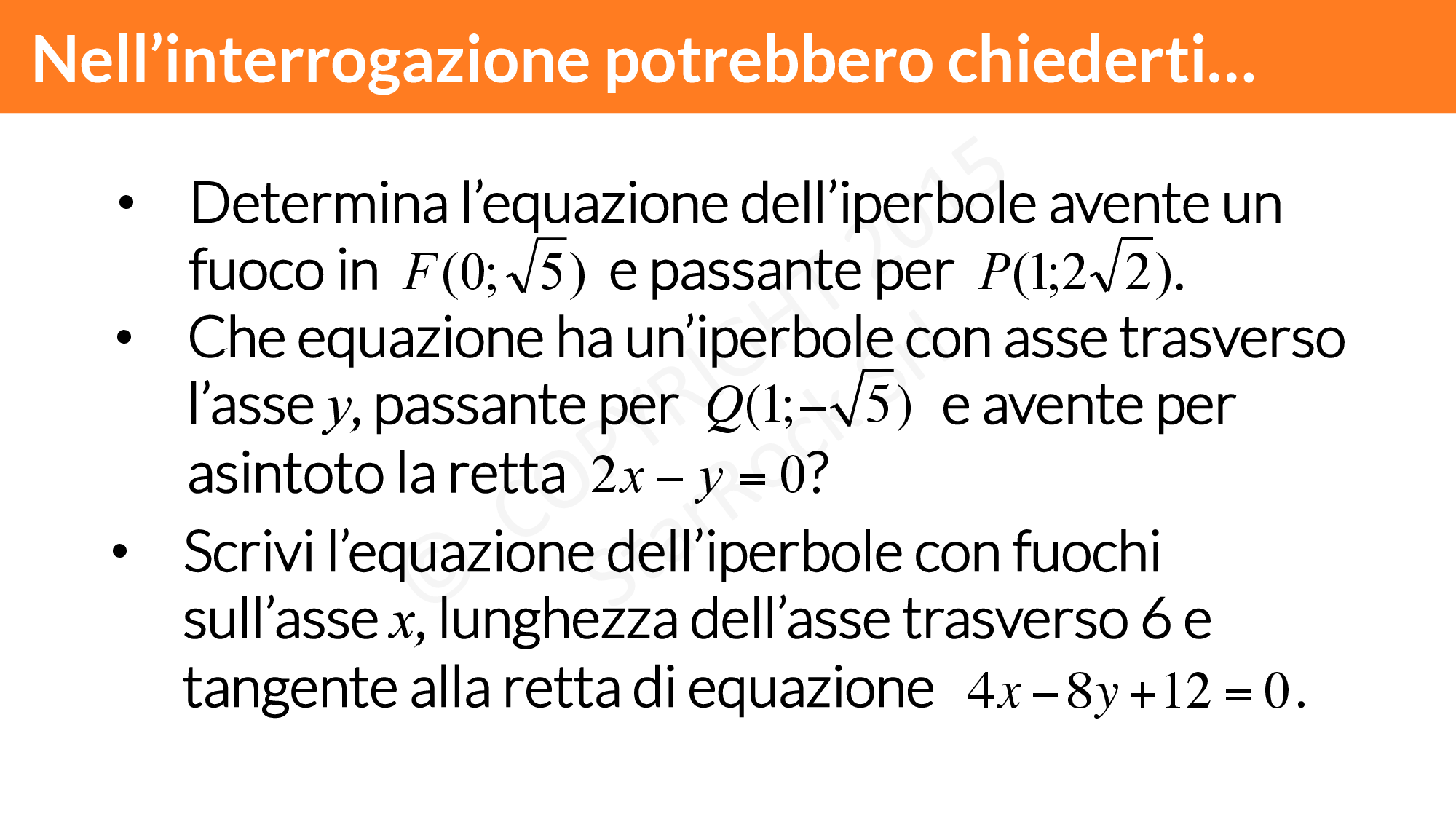 Ora che hai visto quali sono le condizioni per trovare l’equazione di un’iperbole, prova a risolvere questi esercizi. Così arriverai pronto per l’interrogazione!