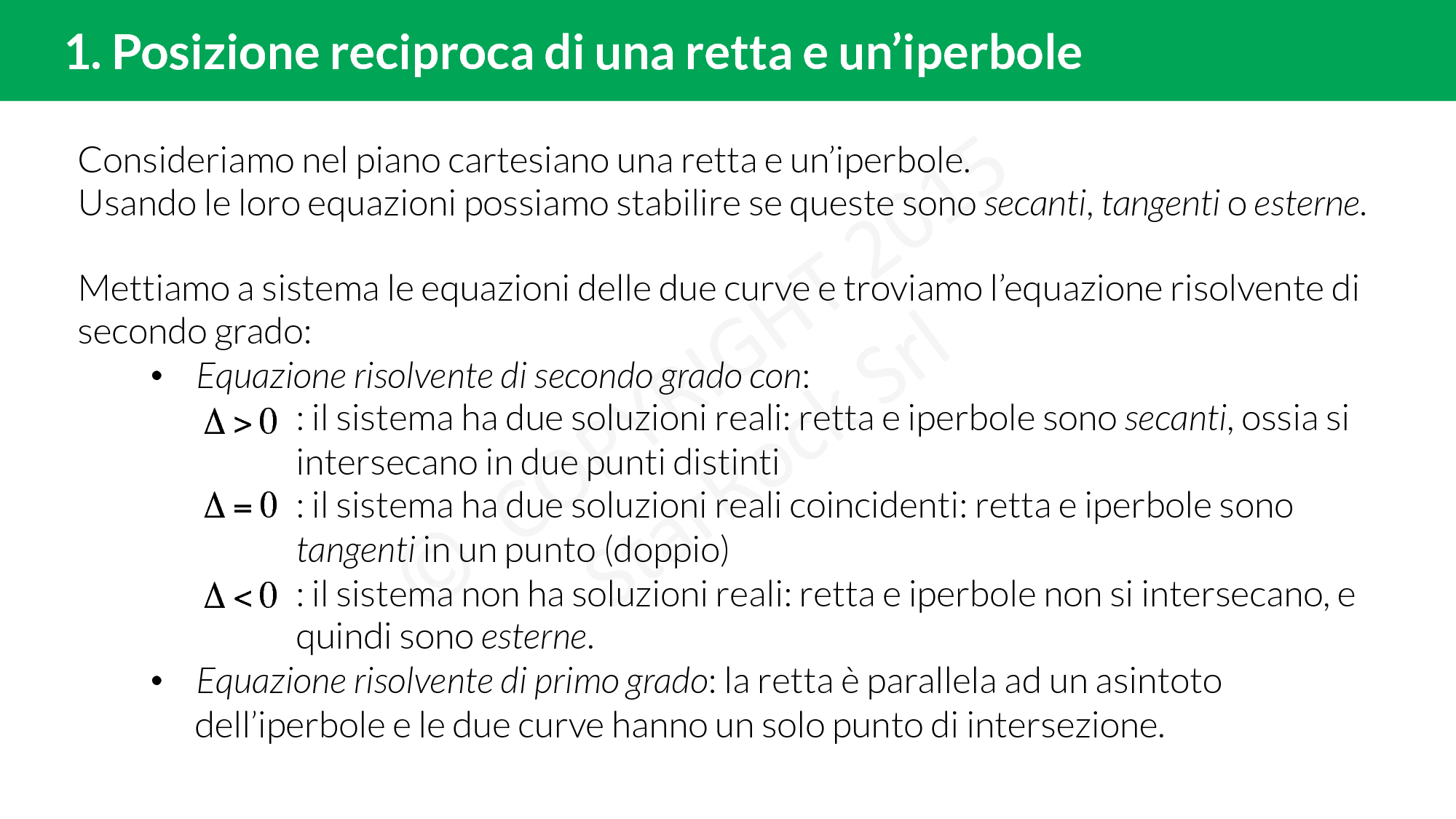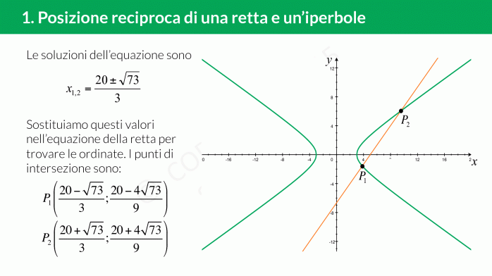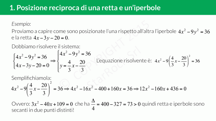 - £$\Delta > 0$£: il sistema ha due soluzioni reali e distinte e quindi retta e iperbole sono secanti, cioè hanno due punti di intersezione;