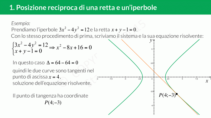 - £$\Delta=0$£: il sistema ha due soluzioni reali coincidenti, quindi c’è un solo punto di intersezione fra retta e iperbole, cioè le due curve sono tangenti;