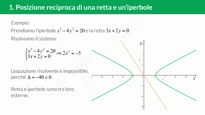 - [iol_placeholder type="formula" engine="katex" display="inline"]\Delta sistema non ha soluzioni reali, quindi retta e iperbole sono esterne, cioè non hanno punti di intersezione.