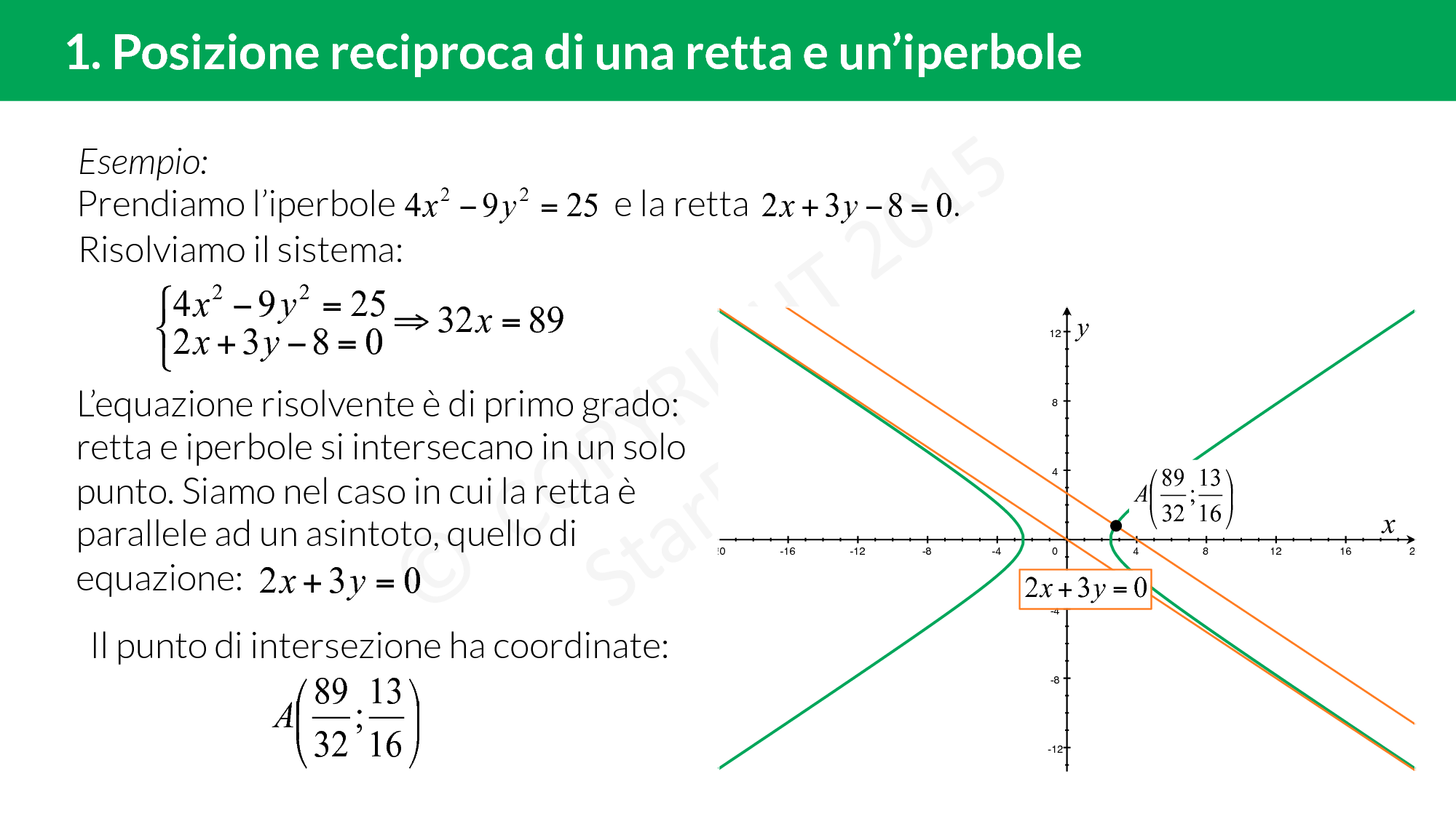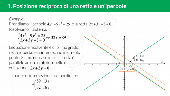 Se l’equazione risolvente è di primo grado invece, allora la retta è parallela ad un asintoto dell’iperbole e le due curve hanno un solo punto di intersezione.