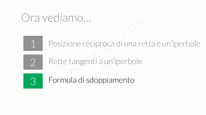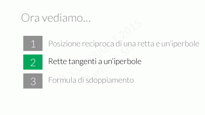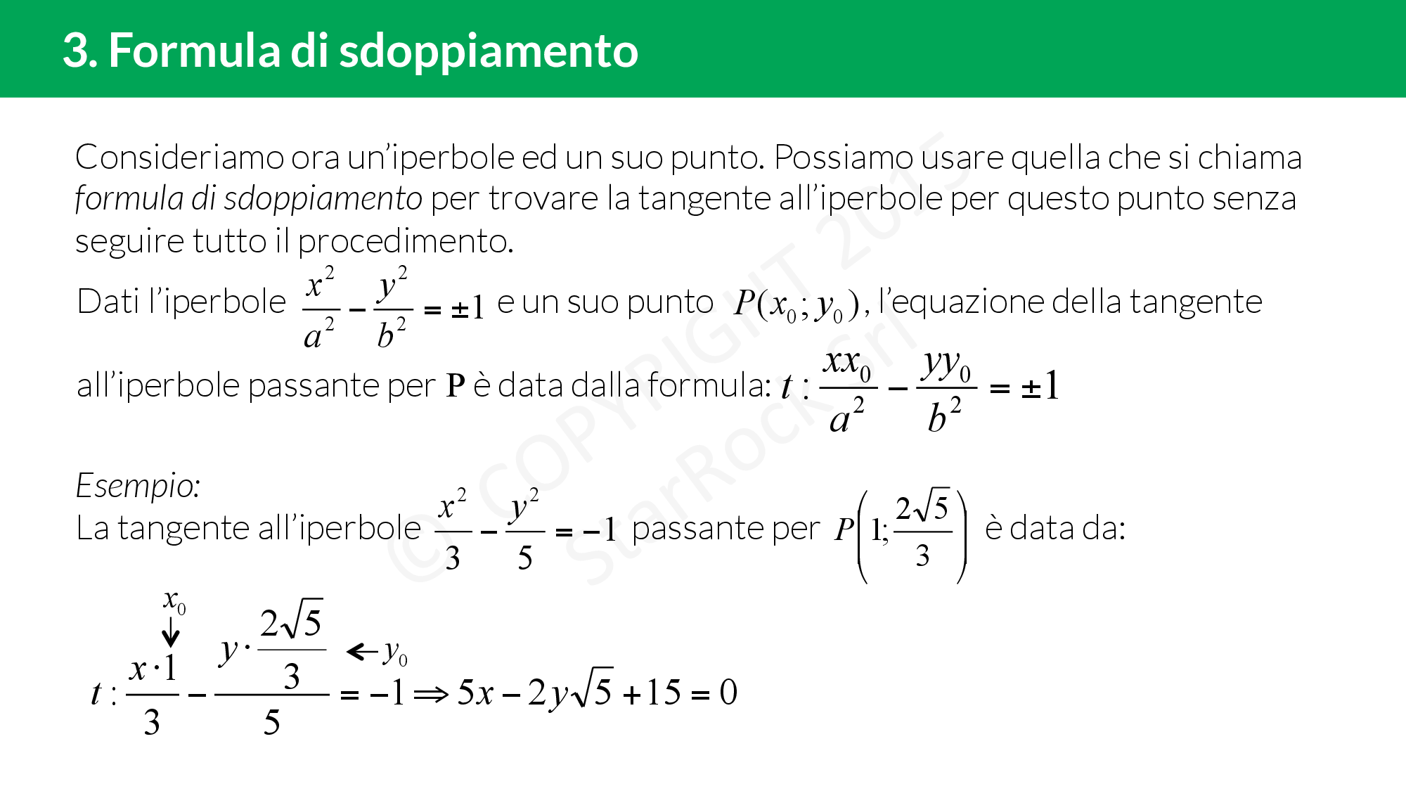 Se il punto appartiene all’iperbole ed è anche un punto di tangenza, allora la formula di sdoppiamento permette di trovare l’equazione della retta tangente. Imparare a trovare ed analizzare le posizioni reciproche fra retta e iperbole, così come fra retta e retta, retta ed ellisse, o parabola e circonferenza, sarà di grande aiuto per risolvere i problemi con le coniche.