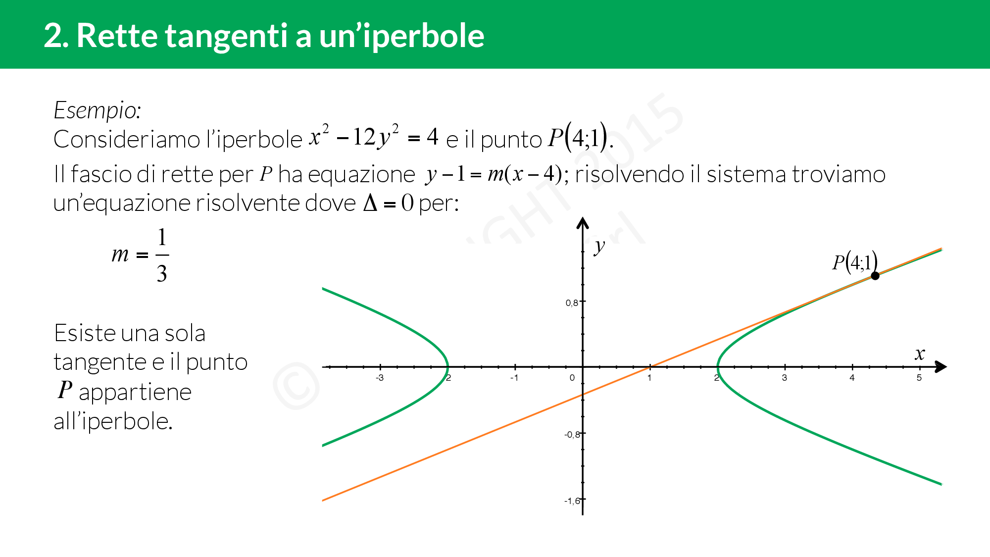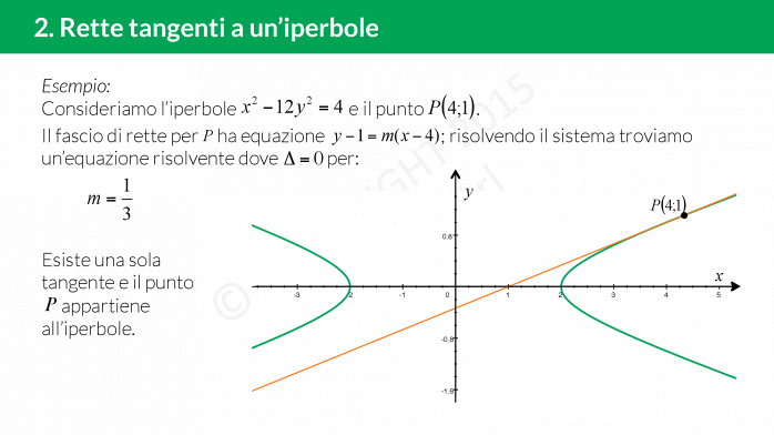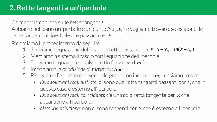 - 2 soluzioni reali coincidenti: c’è una sola retta tangente per £$P$£, che appartiene all’iperbole;