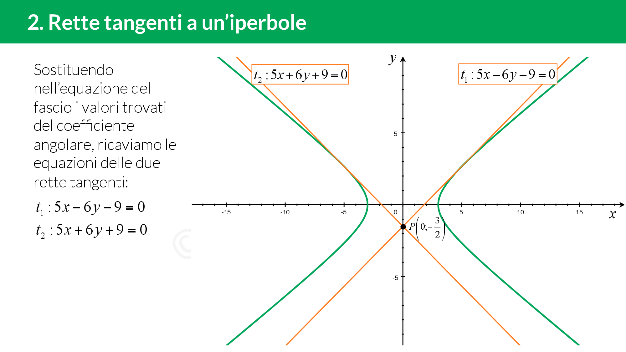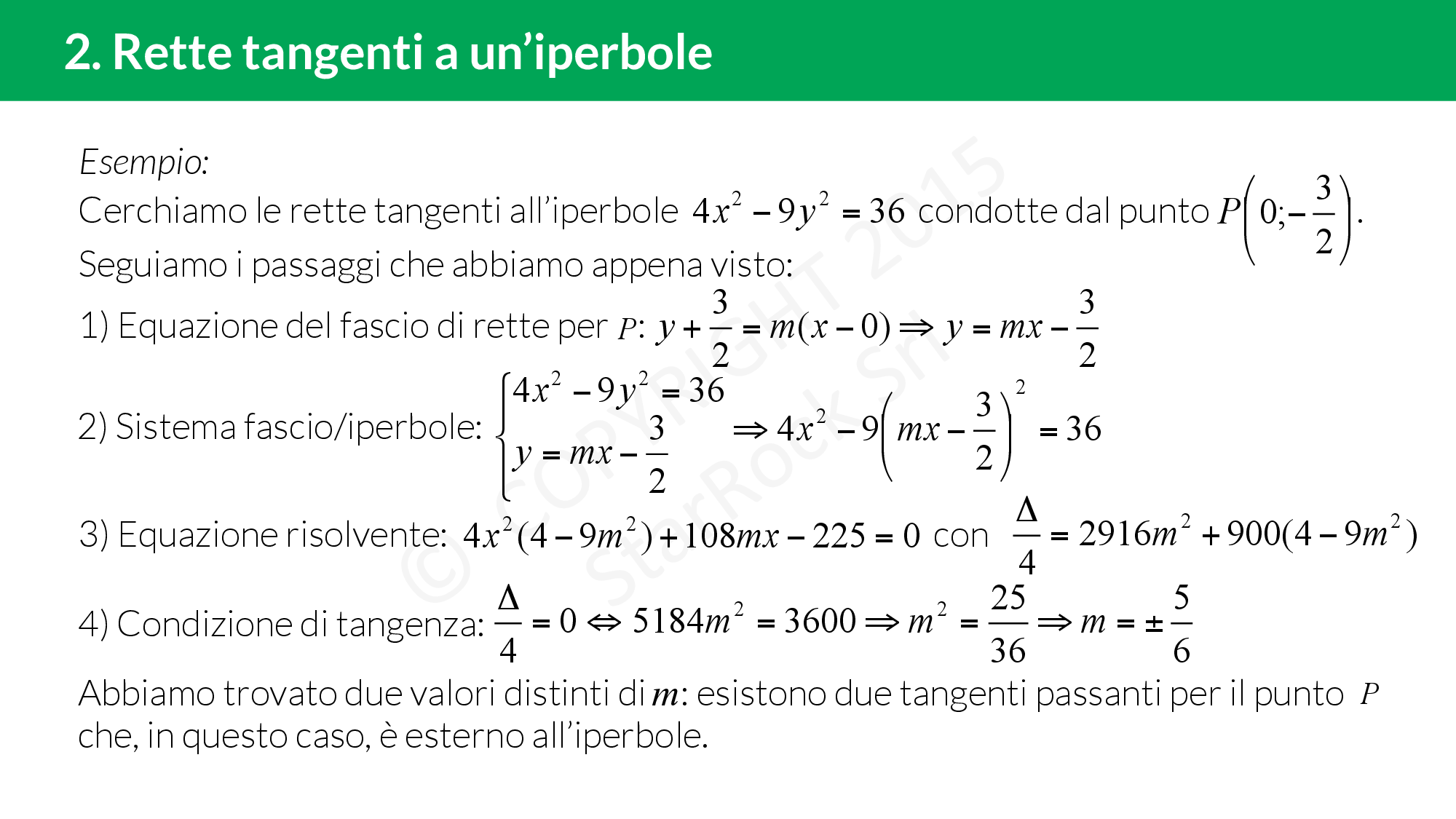 - 2 soluzioni reali e distinte: ci sono due rette tangenti passanti per £$P$£ che, in questo caso, è esterno all’iperbole;