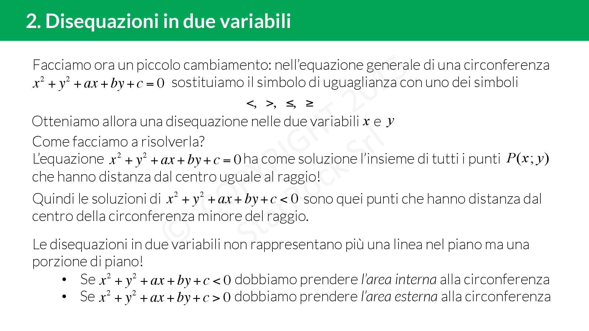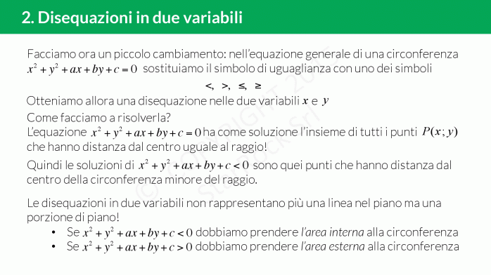- Se [iol_placeholder type="formula" engine="katex" display="inline"]x^2+y^2+ax+by+cl’area interna alla circonferenza