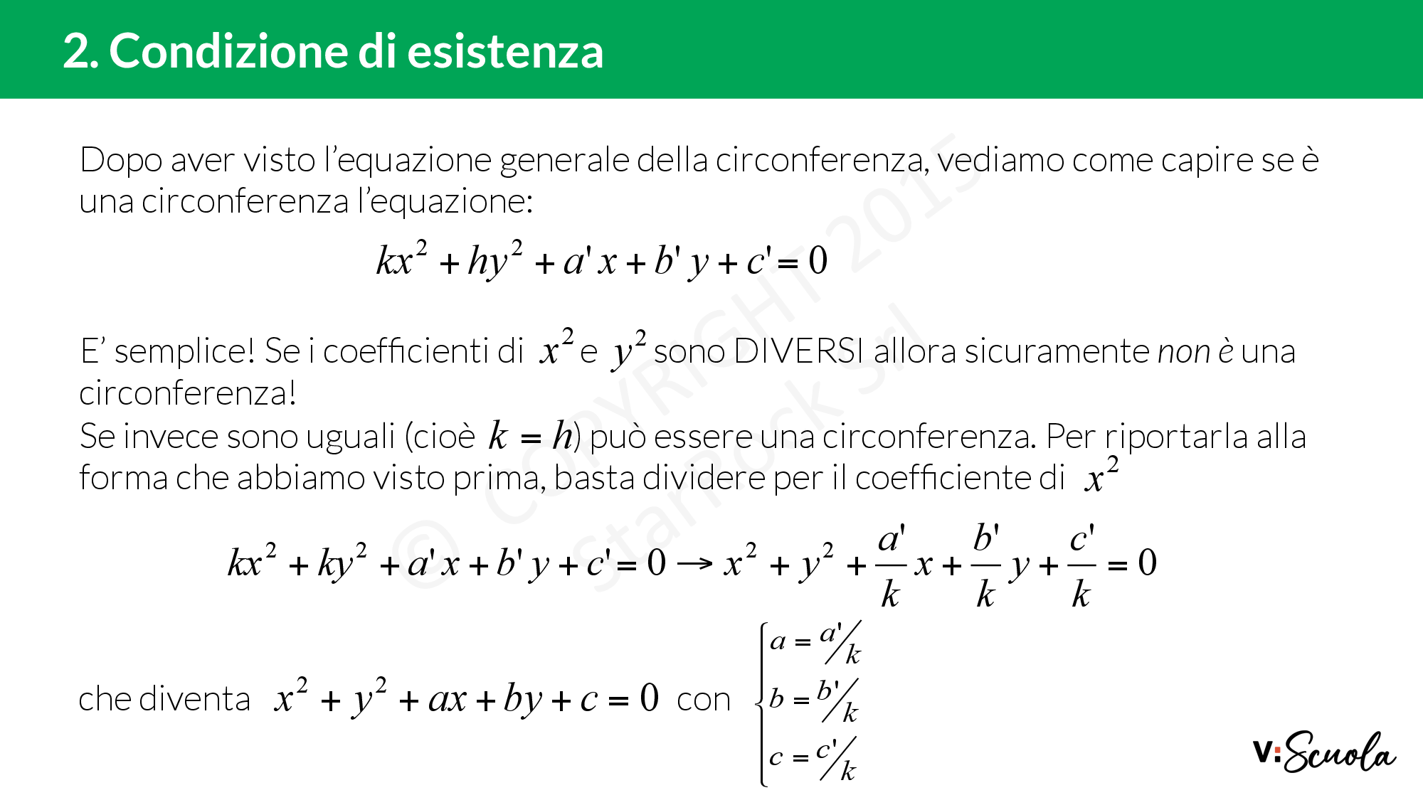 Dopo aver visto l’equazione generale, vediamo come capire se è una circonferenza l’equazione: £$kx^2+hy^2+a’x+b’y+c’=0$£