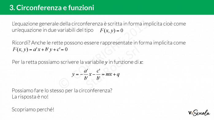 L’equazione generale della circonferenza è scritta in forma implicita cioè come un’equazione in due variabili del tipo £$F(x,y)=0$£