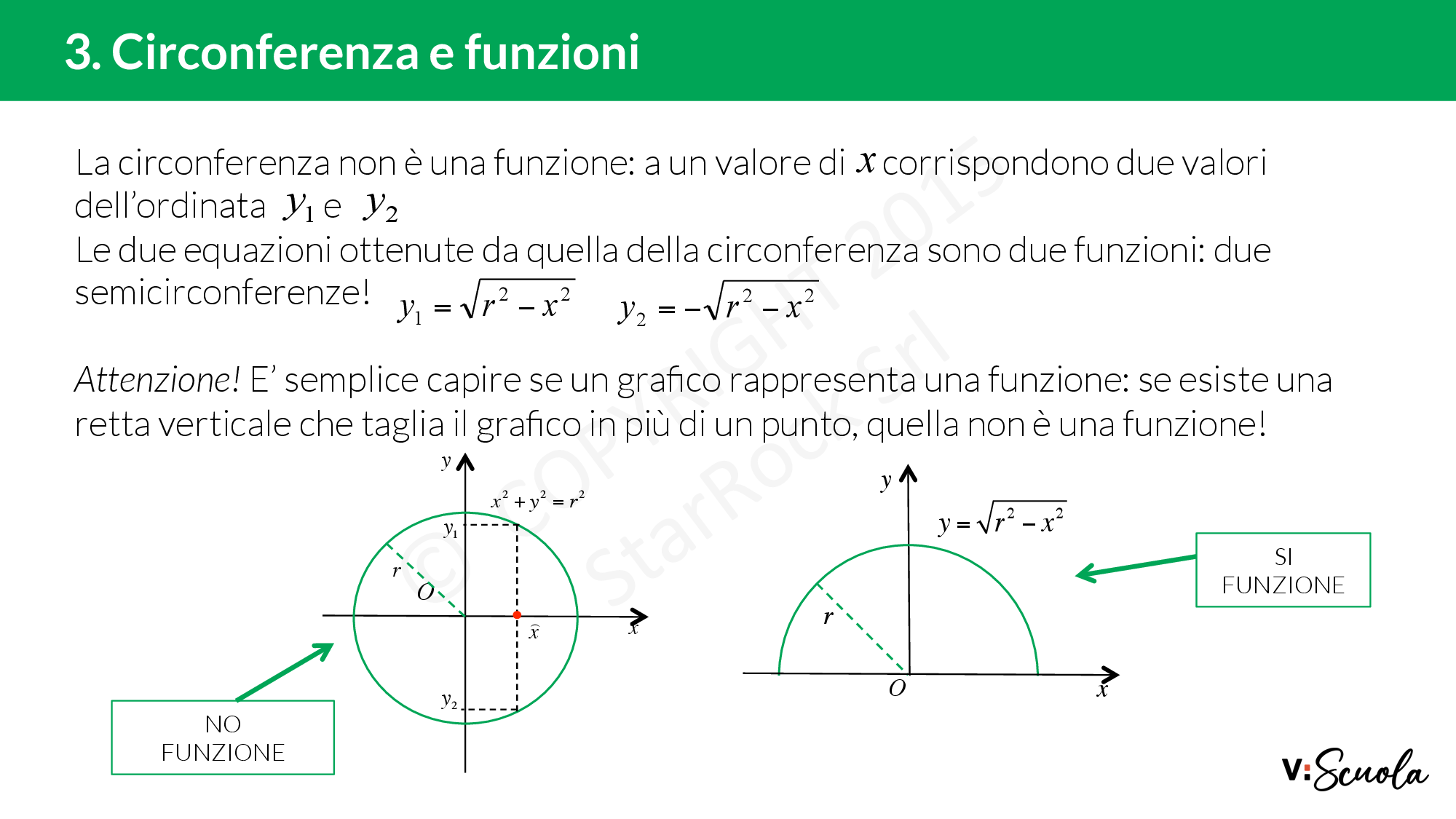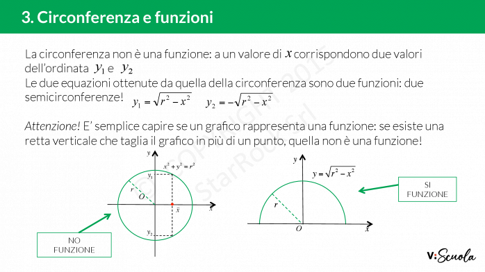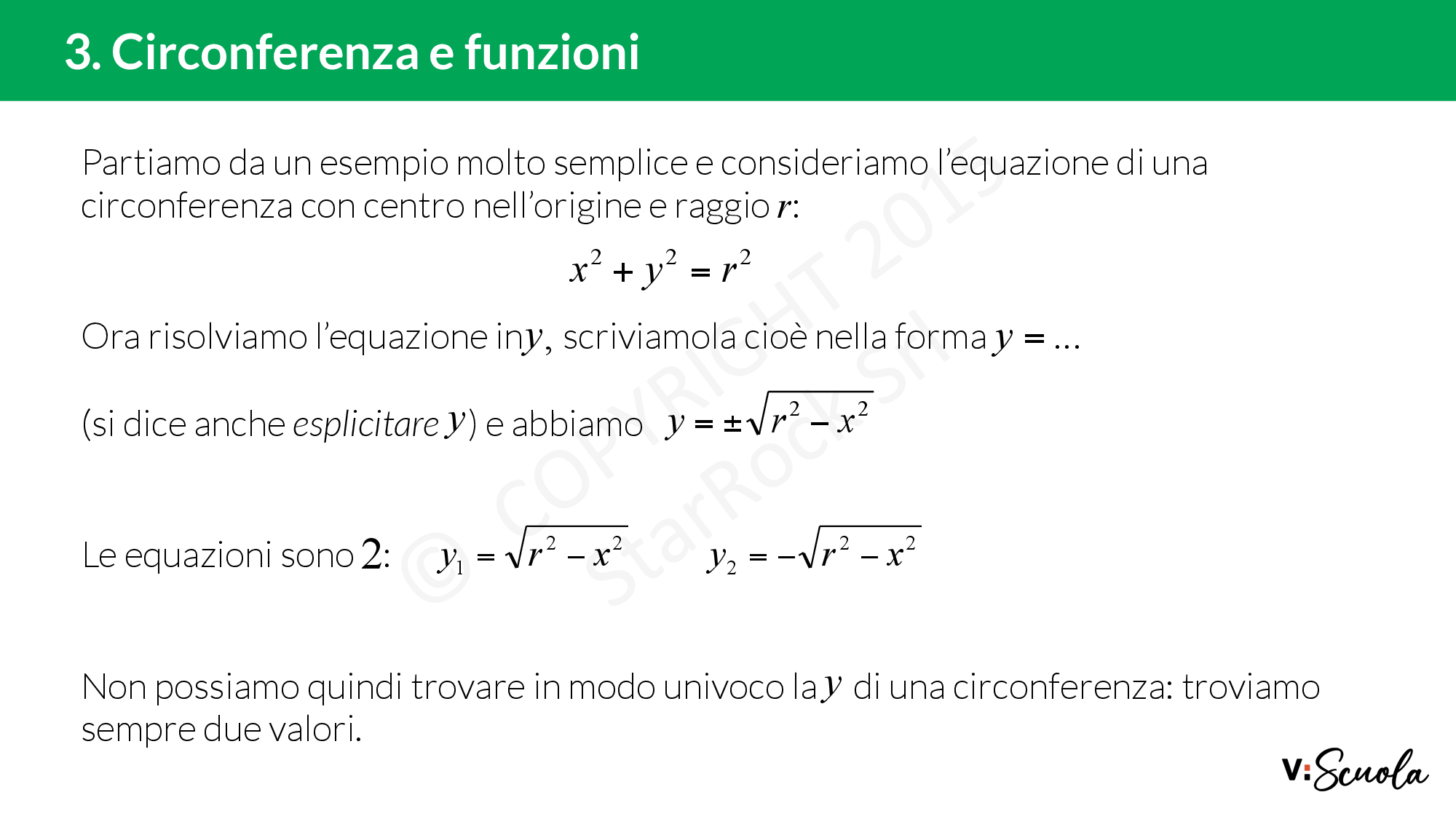 Non possiamo quindi trovare in modo univoco la £$y$£ di una circonferenza (troviamo sempre due valori), quindi NON è una funzione: a un valore di £$x$£ corrispondono due valori dell’ordinata £$y_1$£ e £$y_2$£
