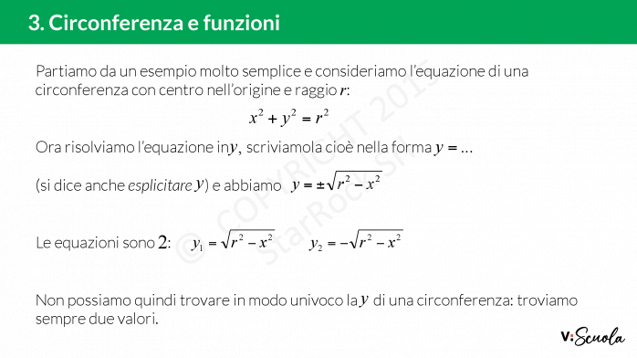 Le due equazioni ottenute da quella della circonferenza sono due funzioni: due semicirconferenze! £$y_1=\sqrt{r^2-x^2}$£ e £$y_2=-\sqrt{r^2-x^2}$£