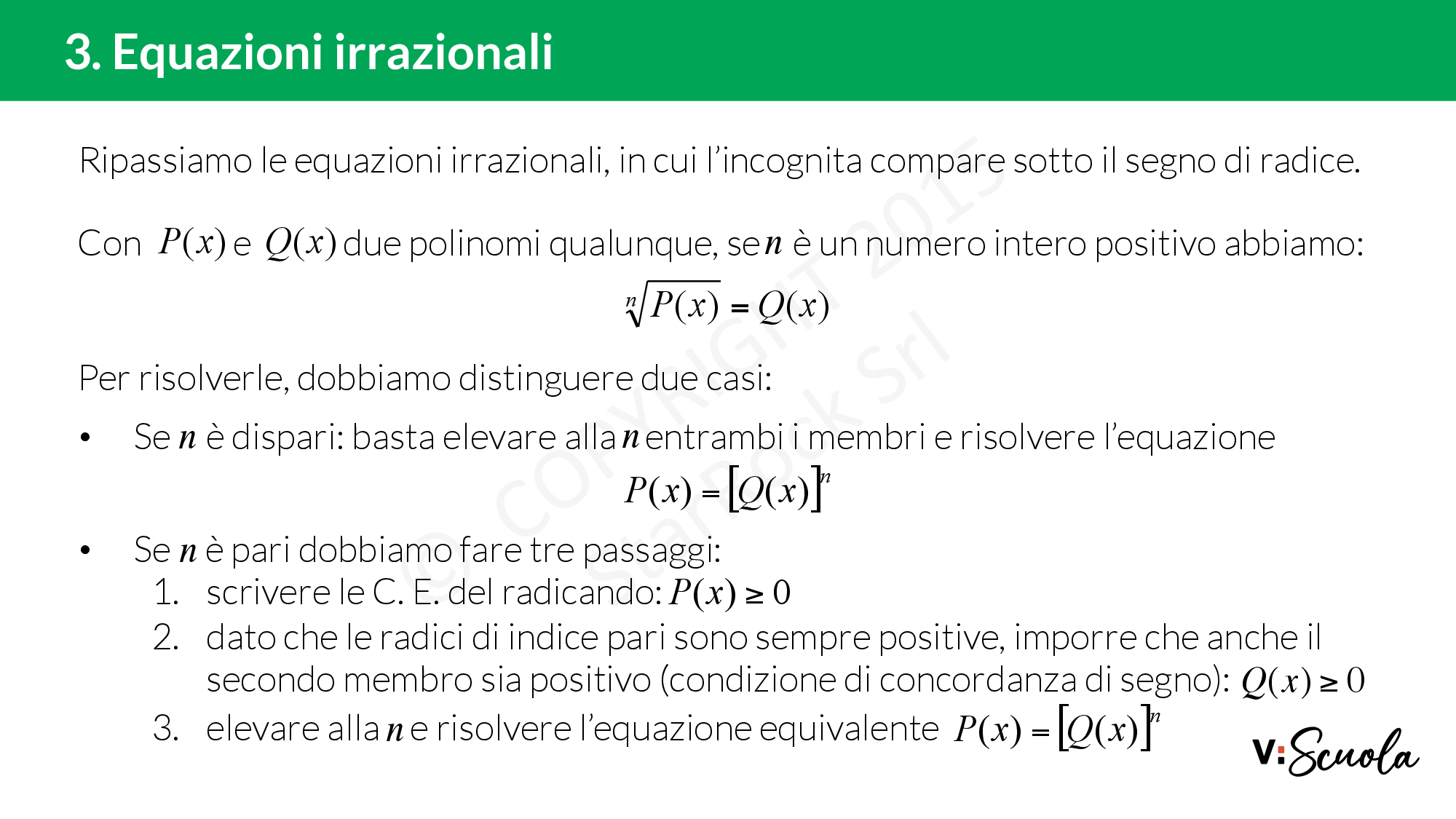 Un’equazione è irrazionale quando l’incognita compare sotto una radice. Ci sono due casi: