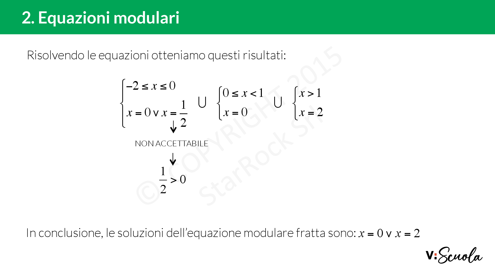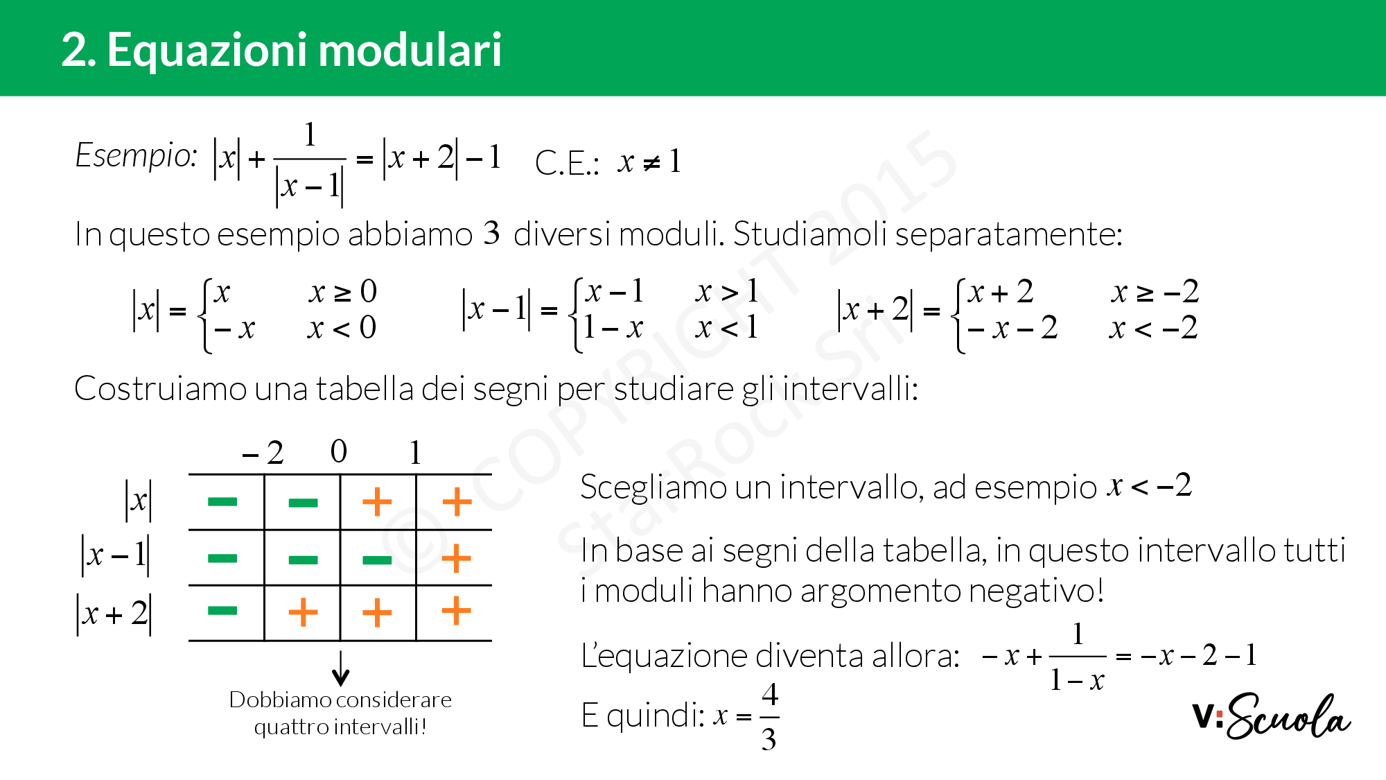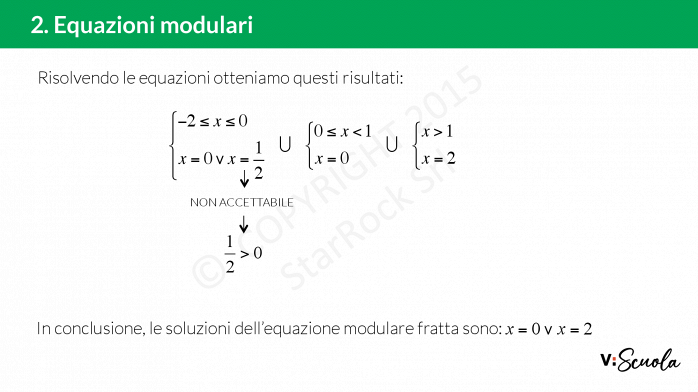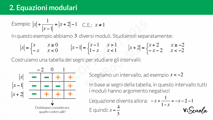 - negli intervalli di negatività, si cambia segno a tutto l’argomento del modulo e si risolve l’equazione