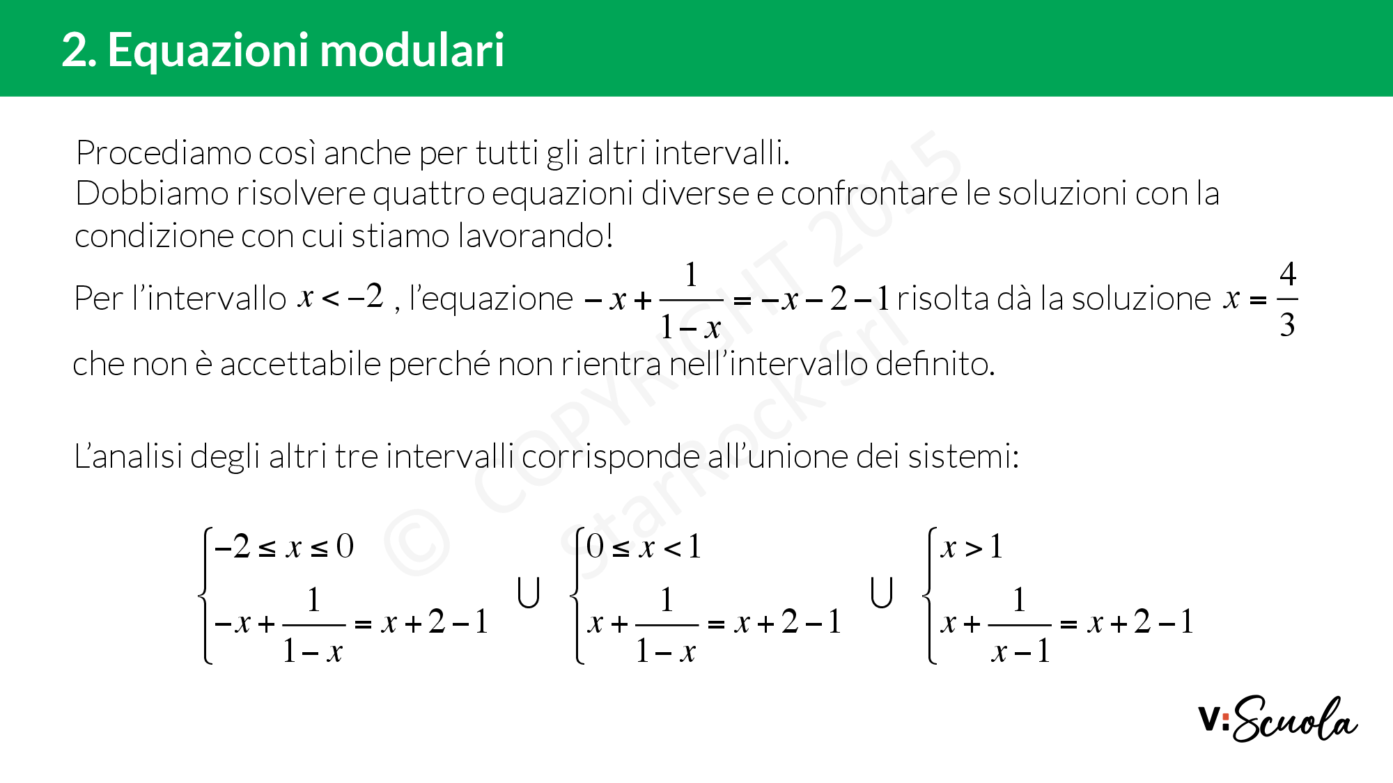 - Scrivi i sistemi tra l’intervallo identificato e la disequazione riscritta senza i moduli. Ricorda di cambiare il segno dei contenuti dei moduli quando negativi.