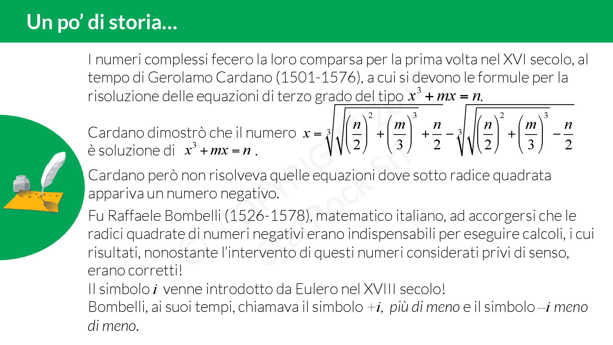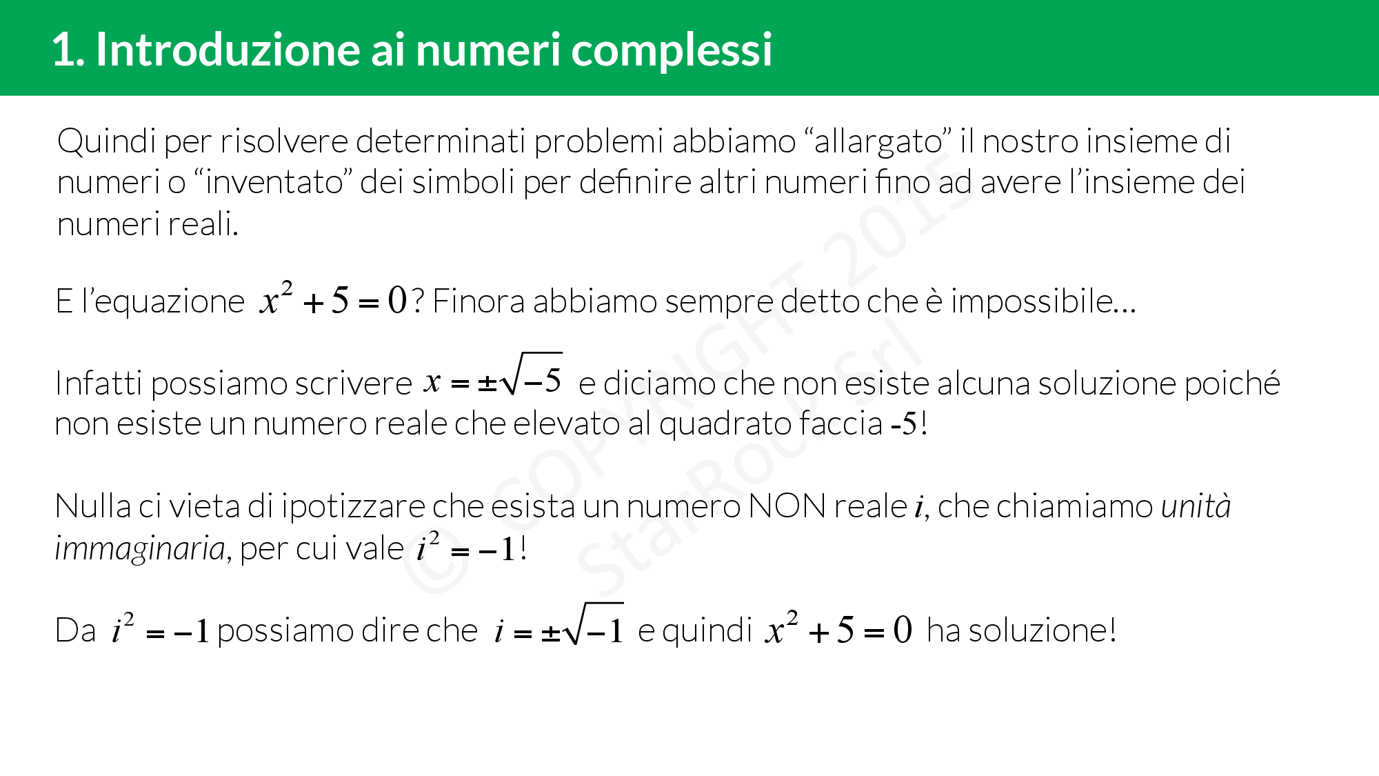 Finora ti hanno sempre detto che non esistono le radici dei numeri negativi. Ora scoprirai che si possono trovare! Come? Introducendo un nuovo insieme di numeri: l’insieme dei numeri complessi £$\mathbb{C}$£!