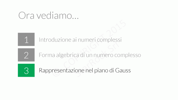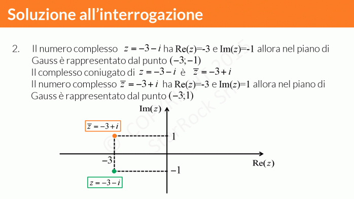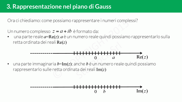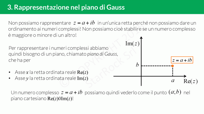 In questa lezione vedrai anche che i numeri complessi non possono essere in corrispondenza biunivoca con la retta poichè non è possibile dire se un numero complesso è più grande di un’altro. Quello che si può fare è associare al numero complesso £$a+ib$£ il punto £$(a; b)$£ nel piano, detto piano di Gauss: sull’asse delle ascisse metterai la parte reale e su quello delle ordinate la parte immaginaria.