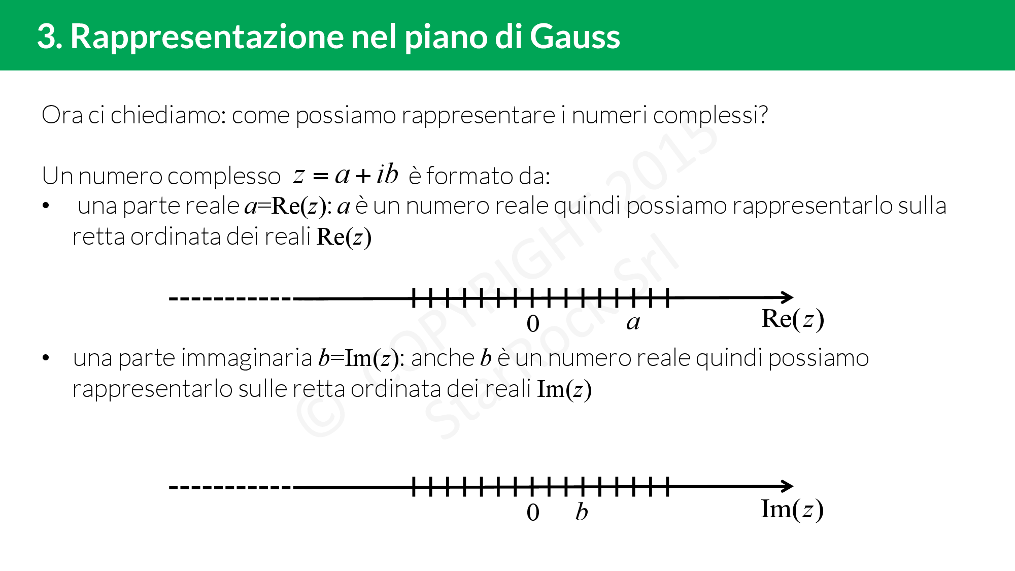£$a$£ viene chiamata parte reale e £$ib$£ parte immaginaria, infatti un numero reale moltiplicato per l’unità immaginaria £$i$£ viene chiamato numero immaginario.