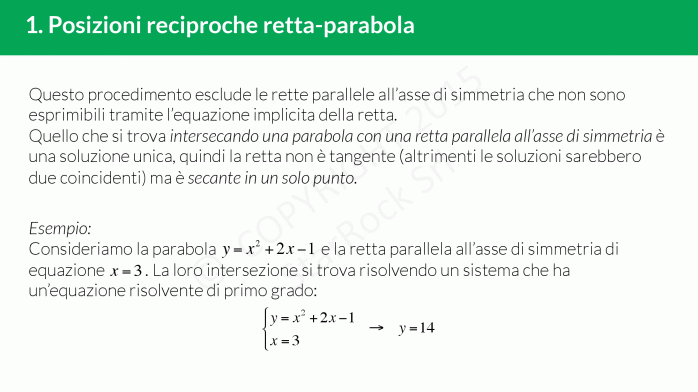 Intersecandole con una parabola il sistema ha una soluzione unica, quindi la retta non è tangente (altrimenti le soluzioni sarebbero due coincidenti) ma è secante in un solo punto.