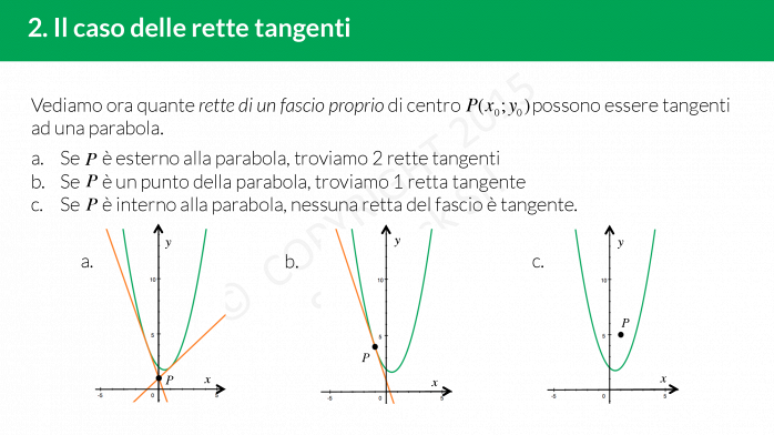 Quante rette di un fascio proprio di centro £$P$£ possono essere tangenti ad una parabola? Dipende dalla posizione del punto rispetto alla parabola.