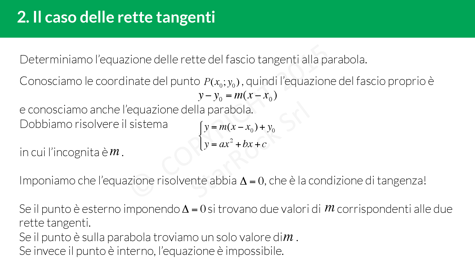 Prendiamo una parabola con asse parallelo all’asse £$y$£ e una retta generica di equazione £$y=mx+q$£. Mettendole a sistema si trova un’equazione risolvente di secondo grado in cui se: