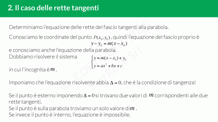 A partire dall’intersezione fra una generica parabola ed il fascio di rette di centro £$P$£, tramite alcuni calcoli algebrici si ottiene l’equazione della retta tangente in £$P$£ tramite la formula: £$\frac{y+y_0}{2}=ax_0x+b\frac{x+x_0}{2}+c$£