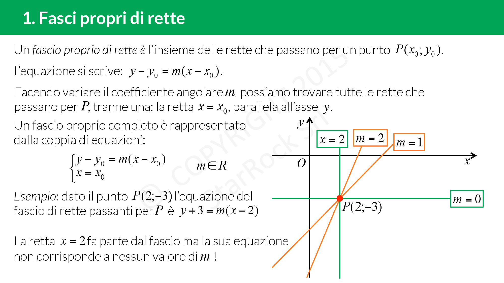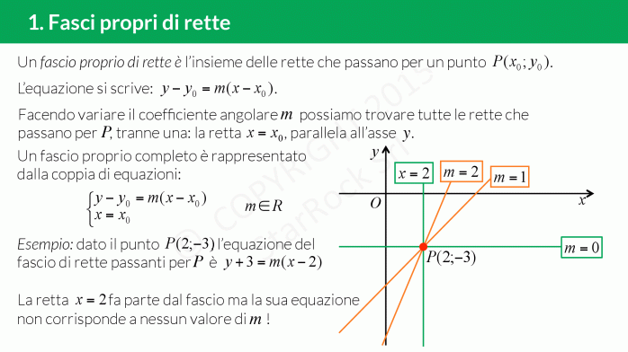 - fascio di rette improprio: è l’insieme delle rette parallele a una retta data. Essendo parallele, hanno tutte lo stesso coefficiente angolare.