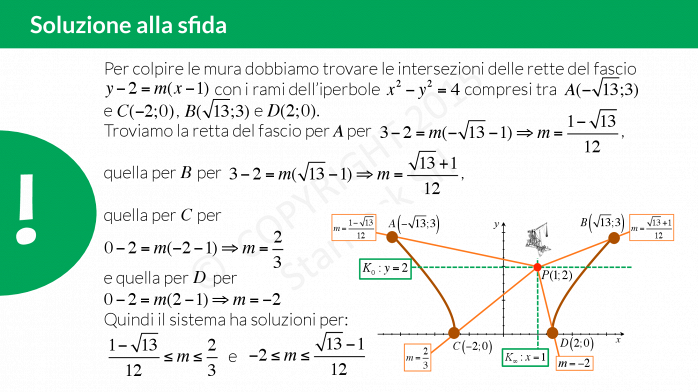Qui trovi un esercizio spiegato passo per passo: imponi per prima cosa le limitazioni su £$x$£ e £$y$£, disegna l’iperbole e poi verifica quante intersezioni ha quest’ultima con il fascio di rette!
