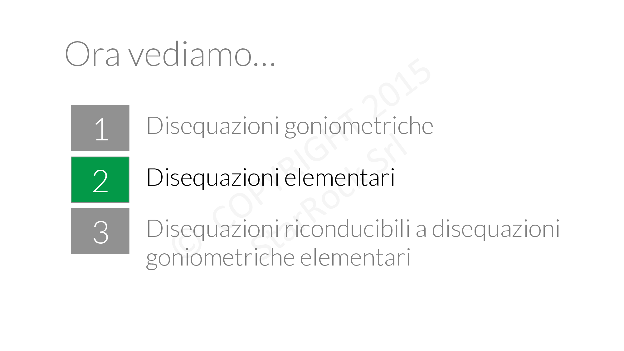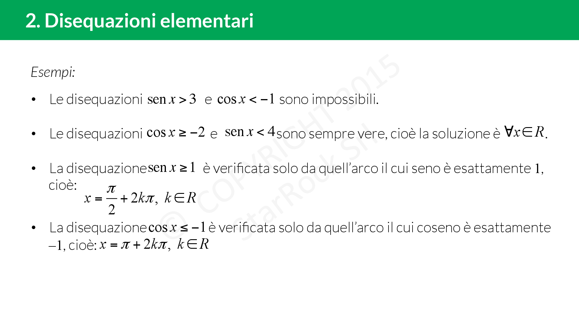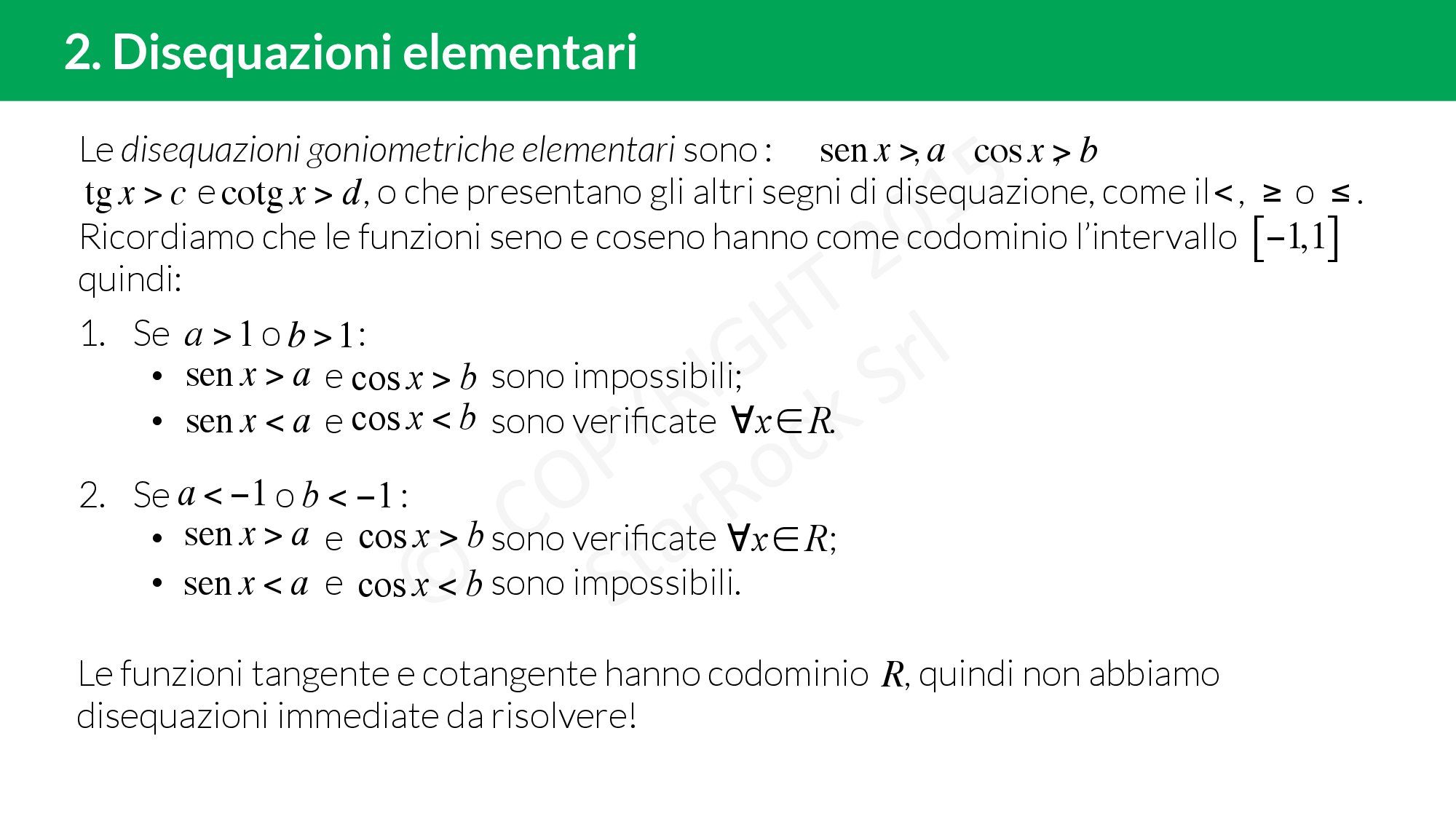 Le disequazioni goniometriche elementari sono del tipo £$sen \ x > a$£, £$cos \ x > b$£, £$tg \ x > c$£ o £$cotg \ x > d$£, o equivalentemente puoi trovarle con i segni di £$ < $£, £$ \ge $£ e £$\le$£.