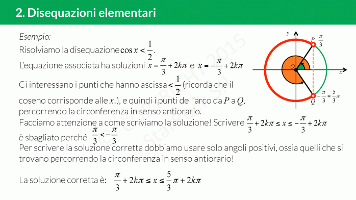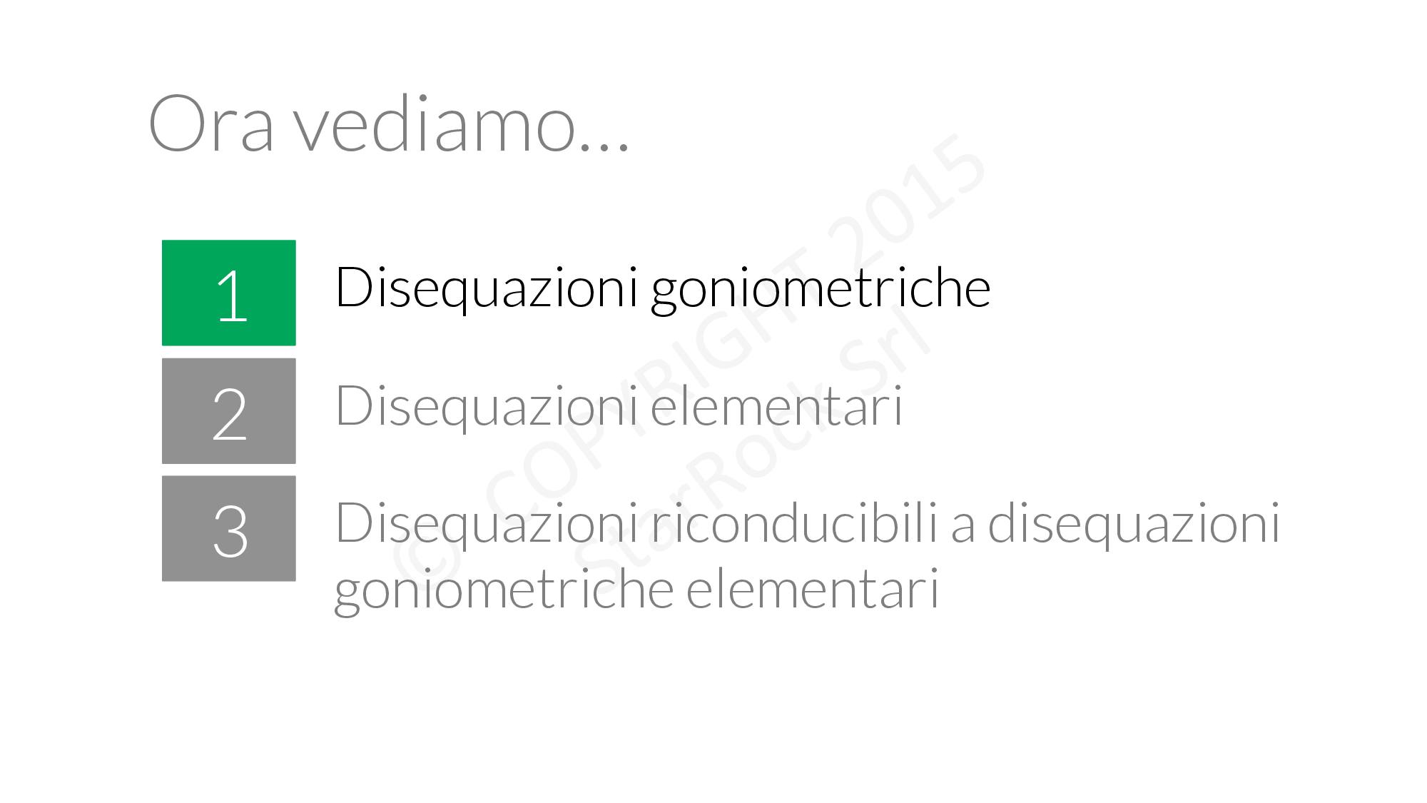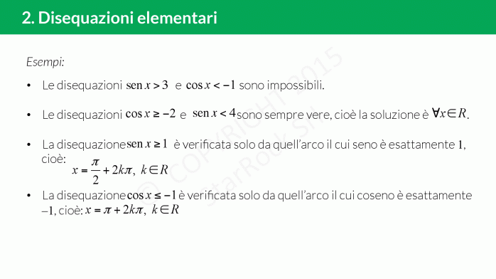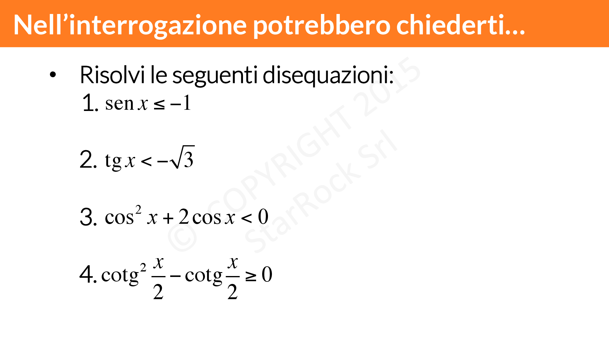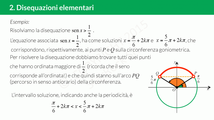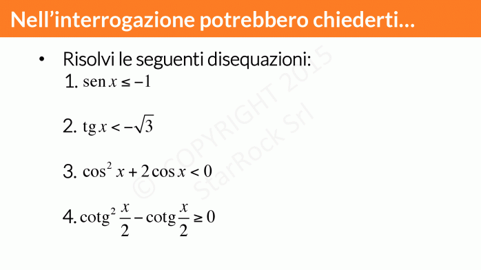 Le disequazioni goniometriche elementari sono del tipo £$sen \ x > a$£, £$cos \ x > b$£, £$tg \ x > c$£ o £$cotg \ x > d$£, o equivalentemente puoi trovarle con i segni di £$ < $£, £$ \ge $£ e £$\le$£.