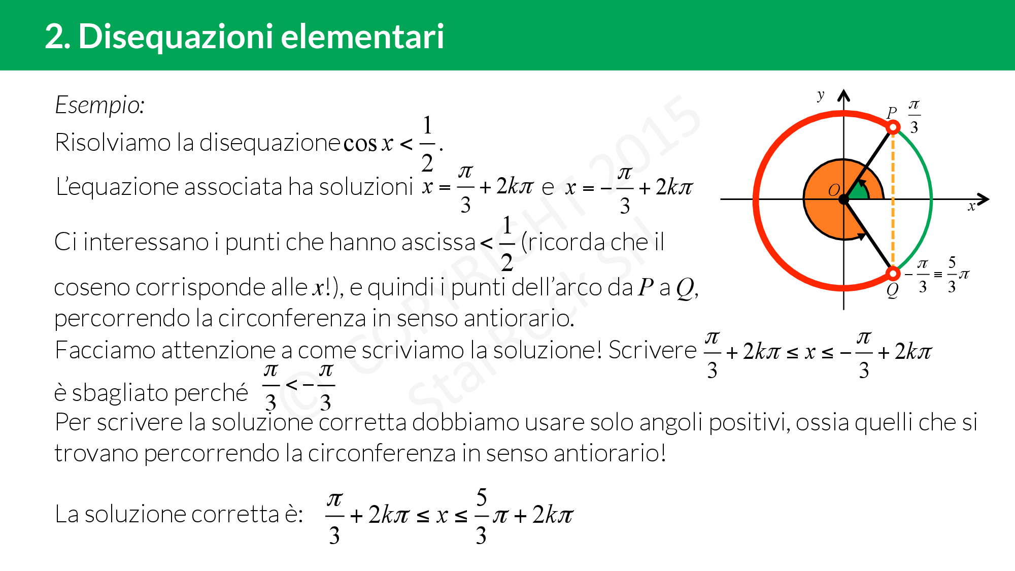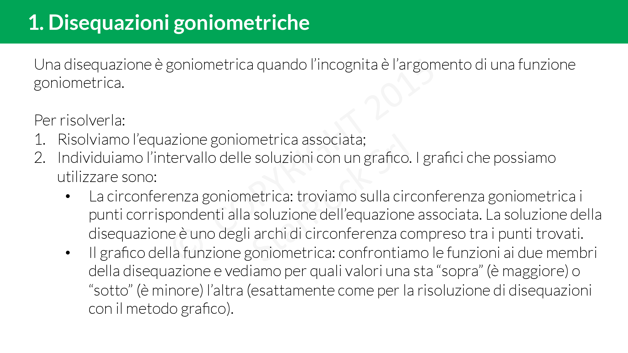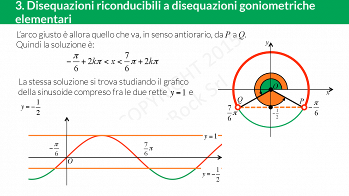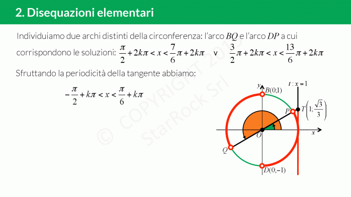 - la circonferenza goniometrica: troviamo sulla circonferenza goniometrica i punti corrispondenti alla soluzione dell’equazione goniometrica associata. La soluzione della disequazione è uno degli archi di circonferenza compreso tra i punti trovati.