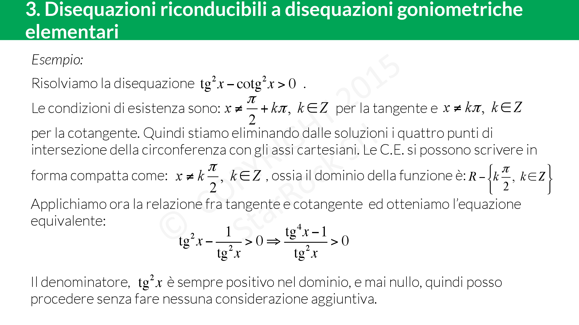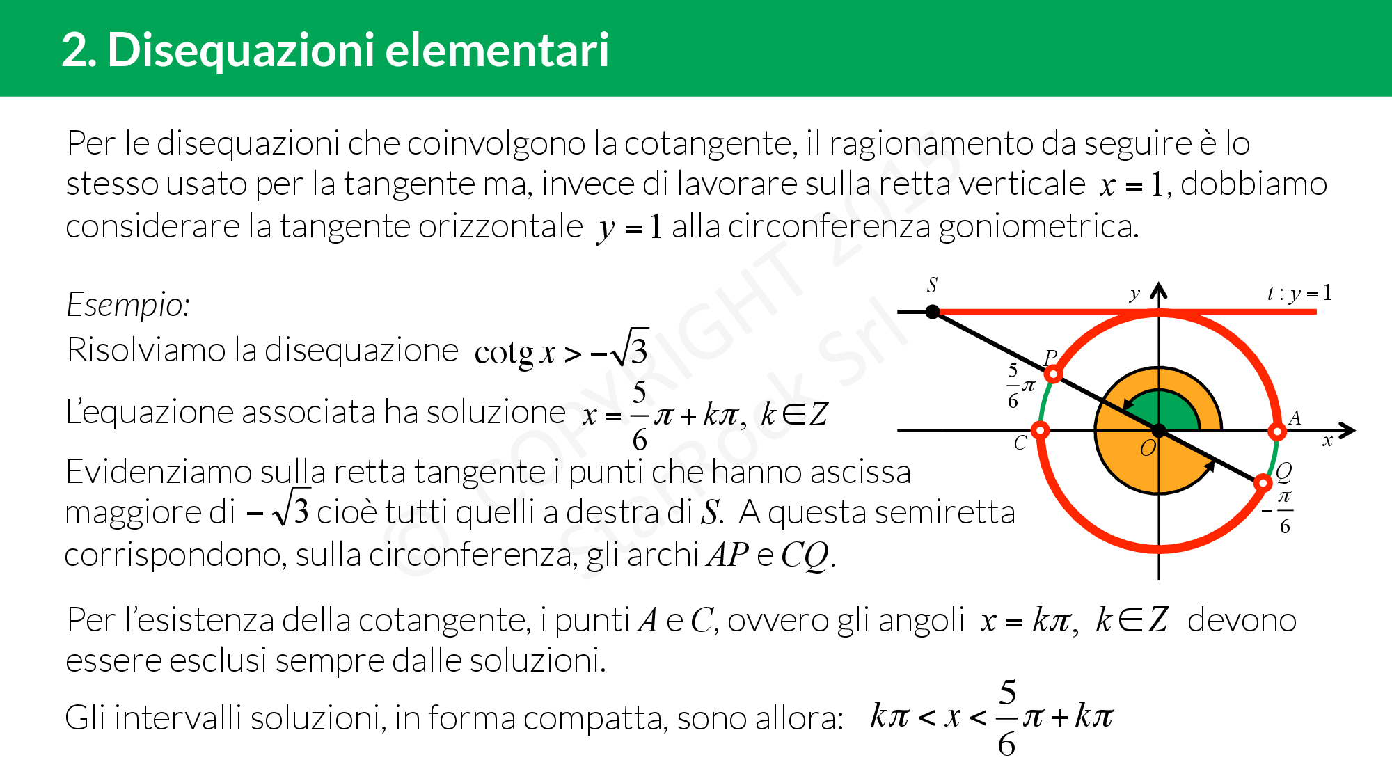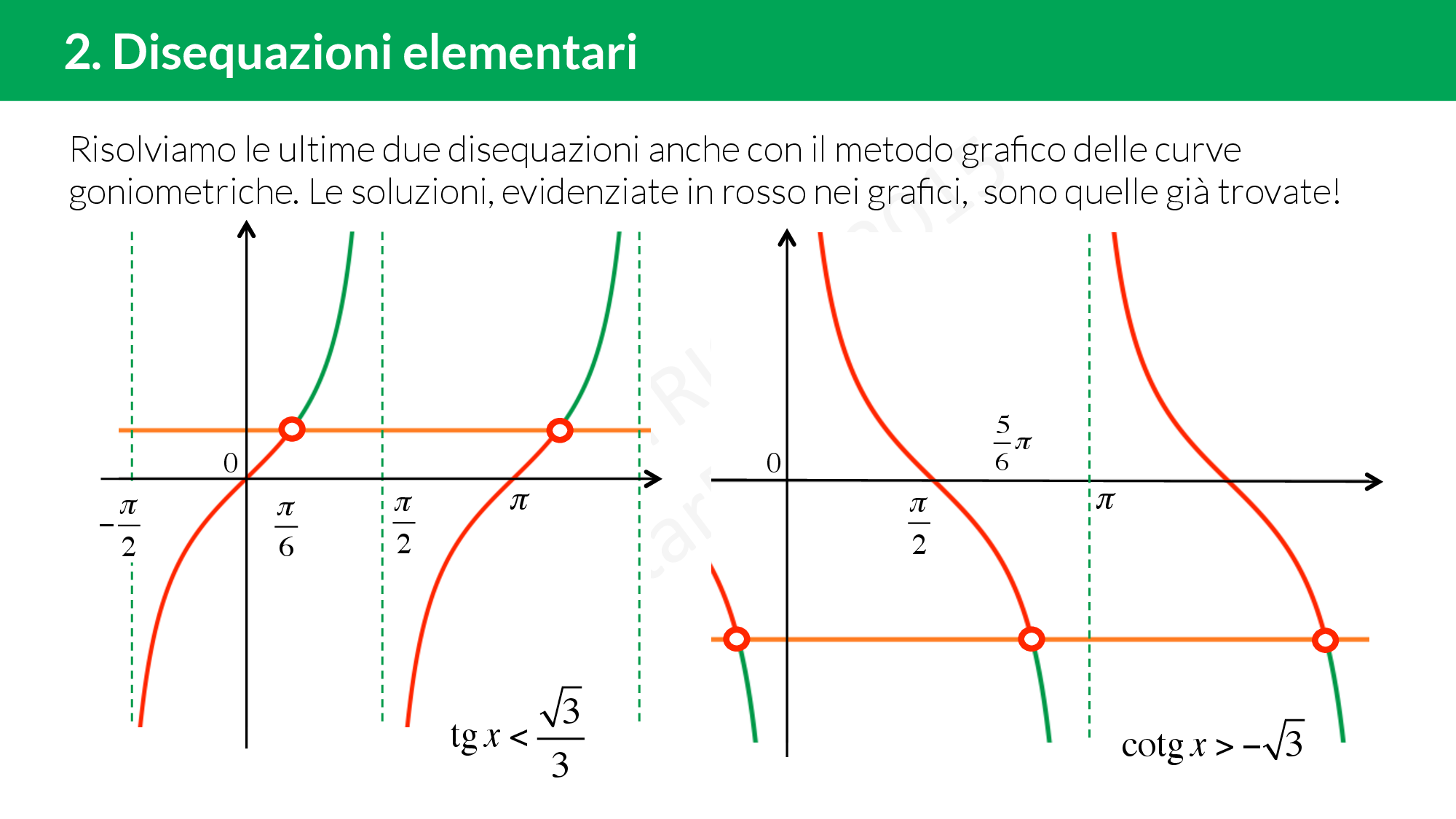 Il codominio della tangente e della cotangente sono tutti i numeri reali, quindi non ci sono limitazioni particolari per le disequazioni goniometriche elementari in tangente e cotangente.