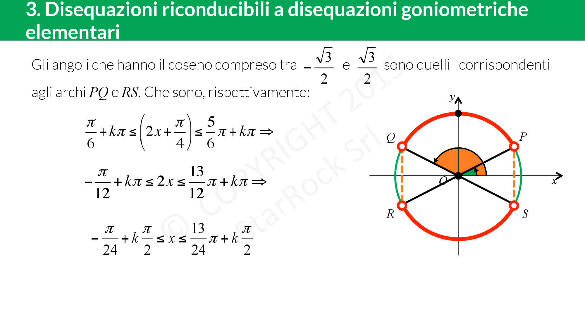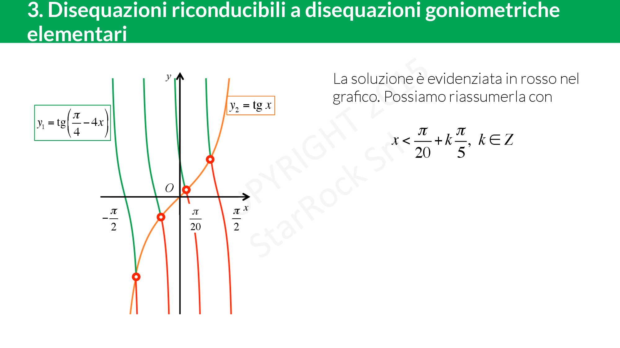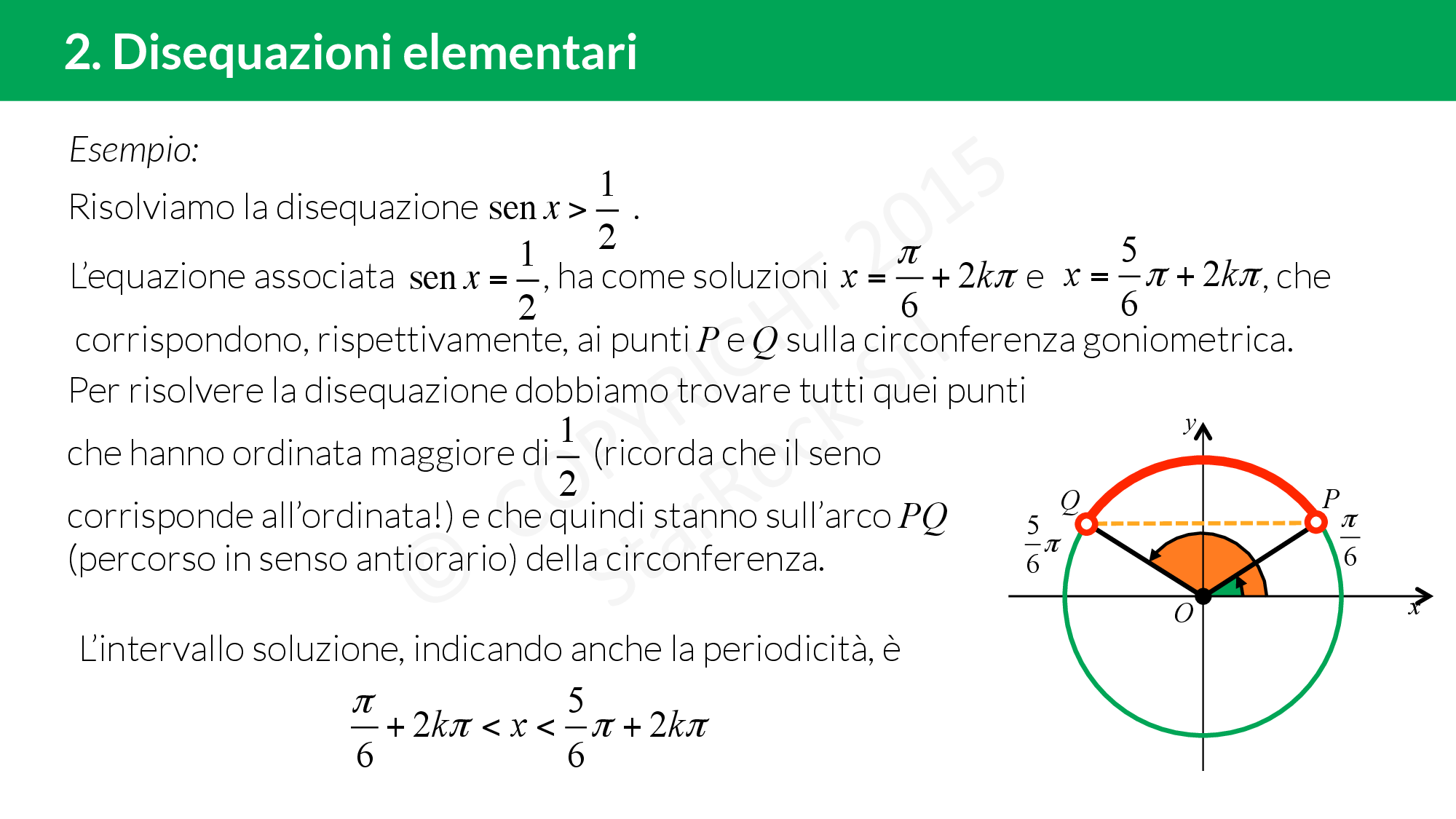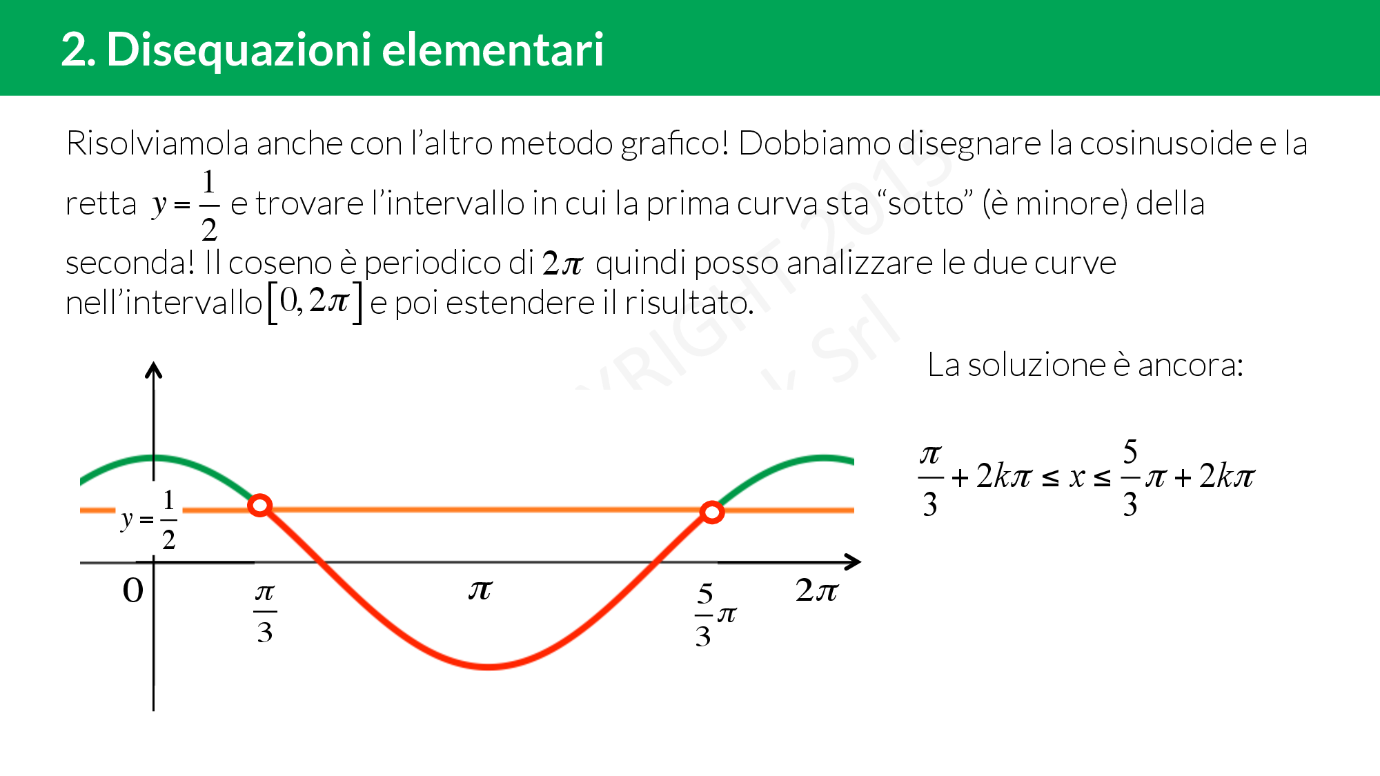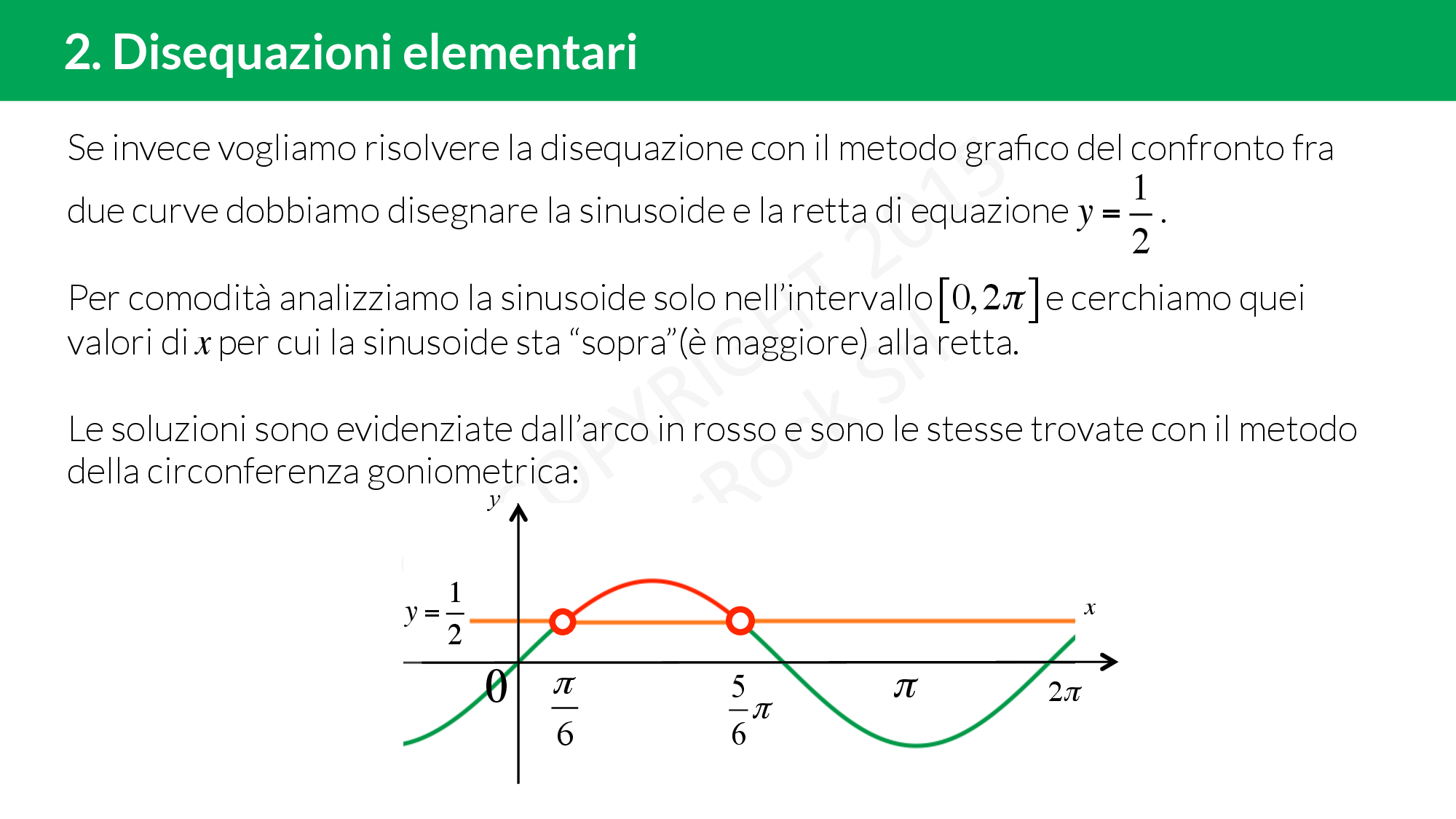 La soluzione delle disequazioni goniometriche riconducibili ad elementari è uguale a quella delle disequazioni elementari. Risolvi l’equazione associata e poi riporta le soluzioni nel grafico da analizzare!