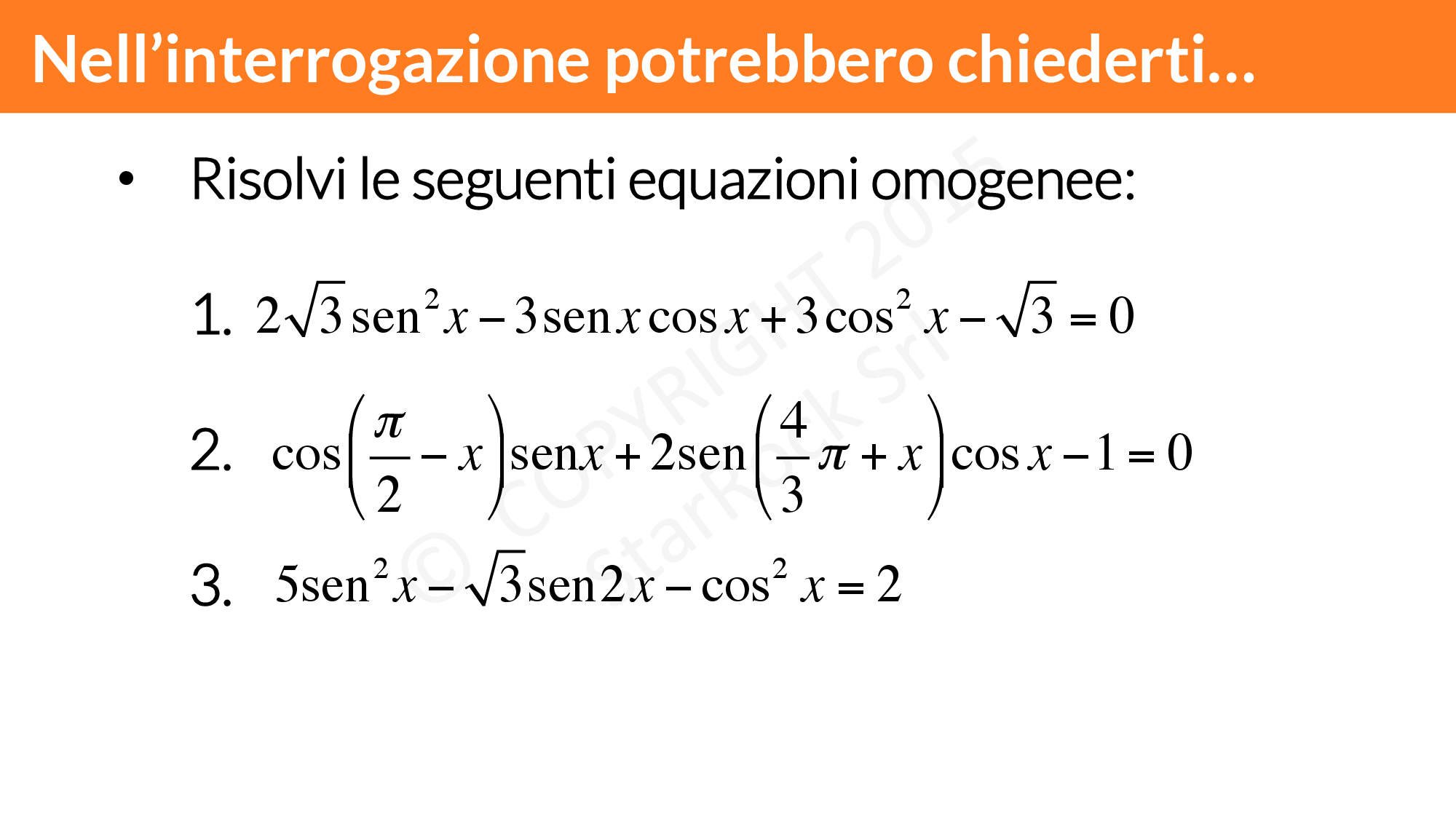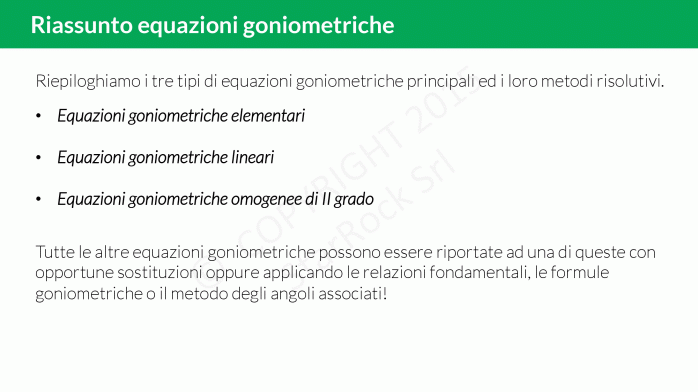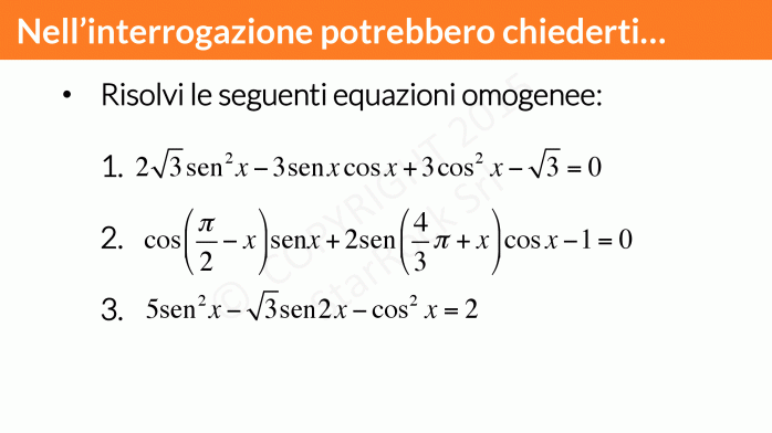 Ora che hai visto come risolvere le equazioni goniometriche omogenee di II grado, prova a risolvere questi esercizi: così saprai se sei pronto per l’interrogazione o per la verifica.