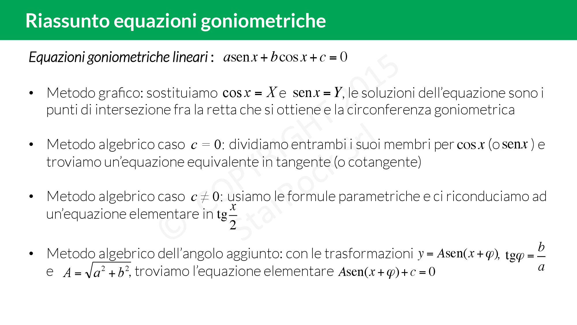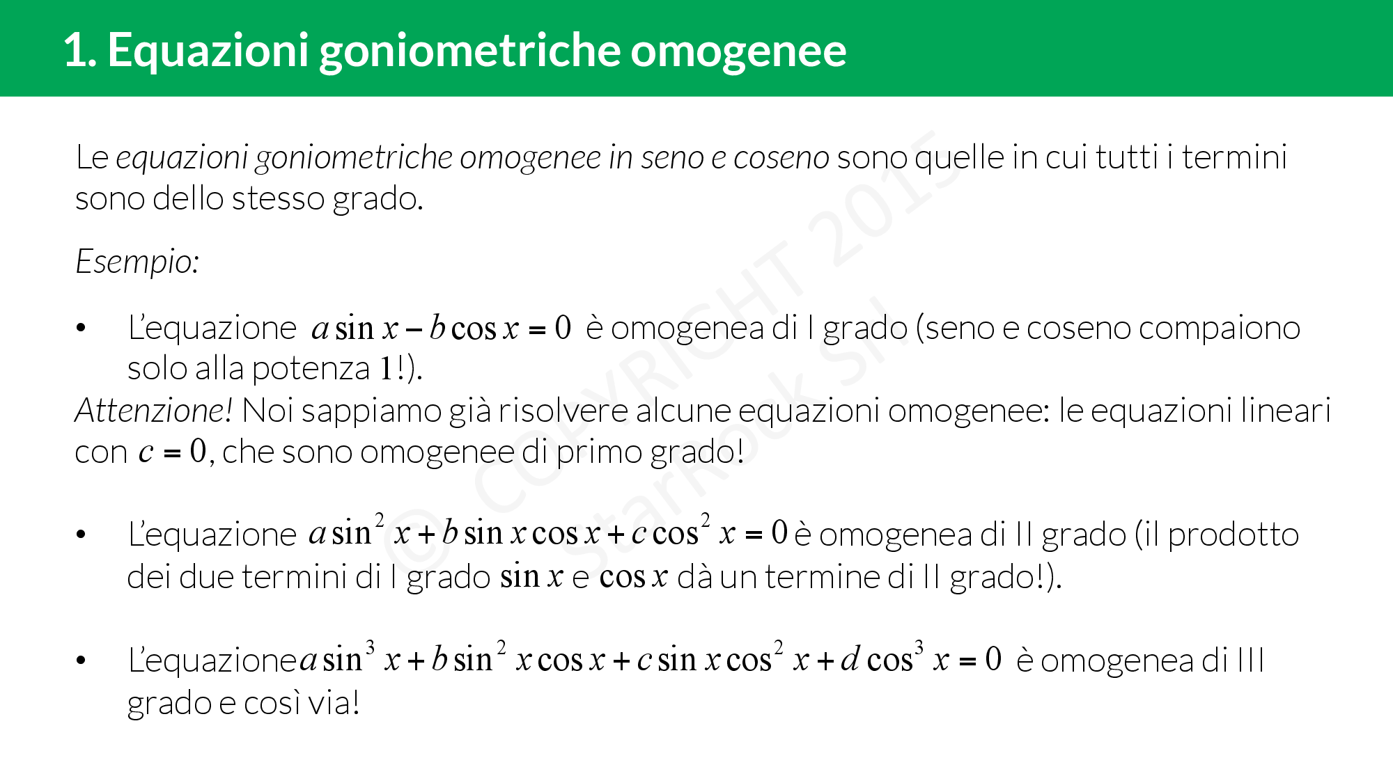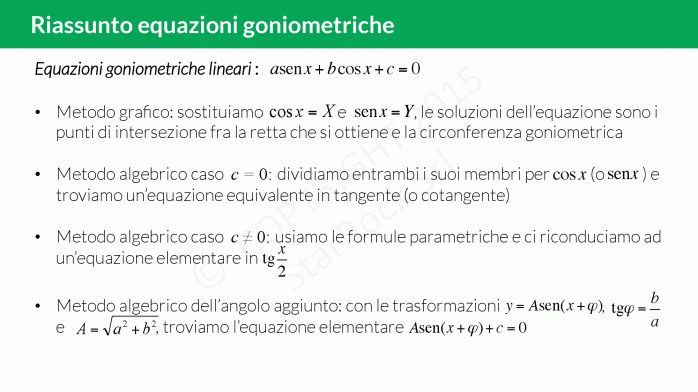 Le equazioni goniometriche lineari con £$c=0$£ sono delle equazioni goniometriche omogenee di primo grado.