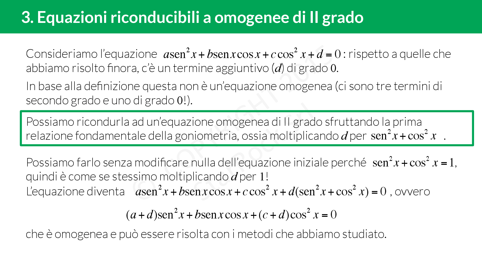 Le equazioni goniometriche del tipo £$a \ sen^2x+b \ sen \ x \ cos \ x +c \ cos \ x + d= 0$£, non sono omogenee ma sono riconducibili ad equazioni omogenee di secondo grado sfruttando la prima relazione fondamentale della goniometria. Basta moltiplicare il termine noto £$d$£ per £$sen^2x+cos^2x$£ per ottenere un’equazione omogenea che sappiamo risolvere.