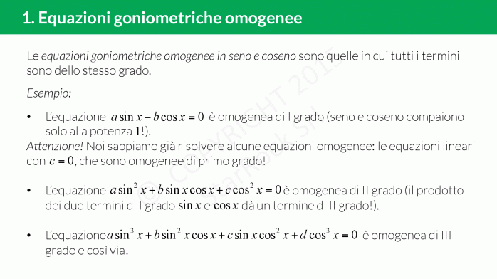Le equazioni goniometriche omogenee in seno e coseno sono quelle in cui tutti i termini sono dello stesso grado.