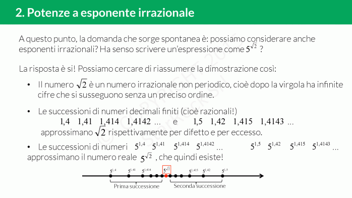 A questo punto, la domanda che sorge spontanea è: possiamo considerare anche esponenti irrazionali? Ha senso scrivere un’espressione come £$ 5^{\sqrt{2}} $£?