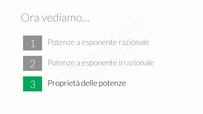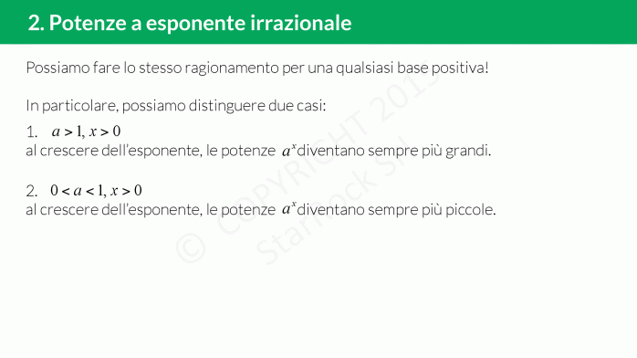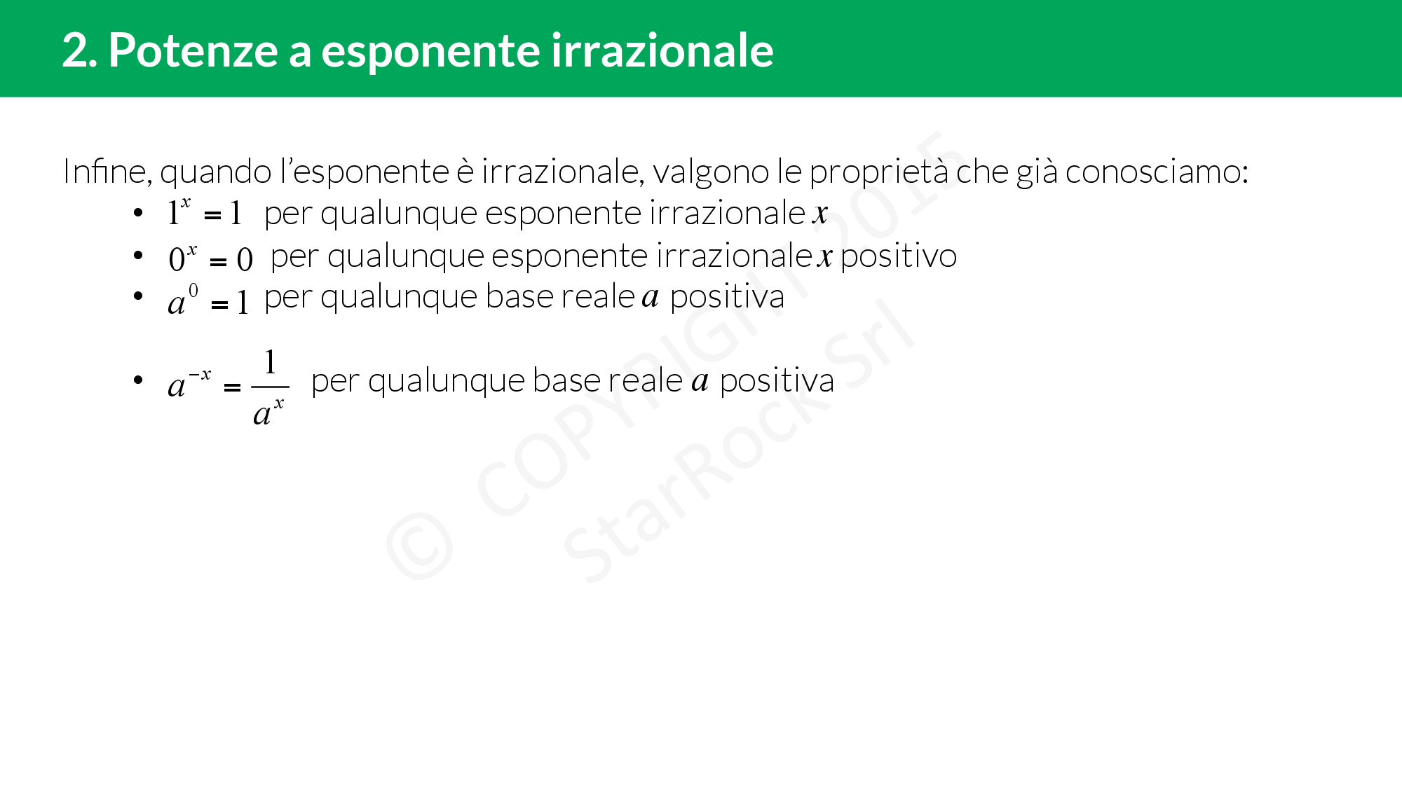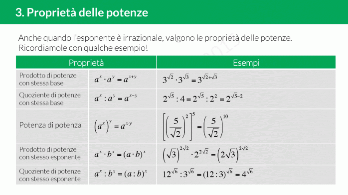 Infine, quando l’esponente è irrazionale, valgono le proprietà che già conosciamo: