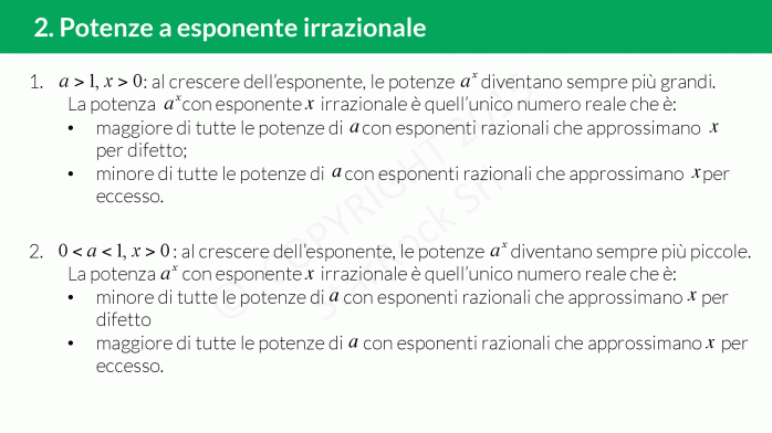 La potenza £$a^x$£ con esponente £$x$£ irrazionale è quell’unico numero reale che è:- maggiore di tutte le potenze di a con esponenti razionali £$x$£ che approssimano per difetto;