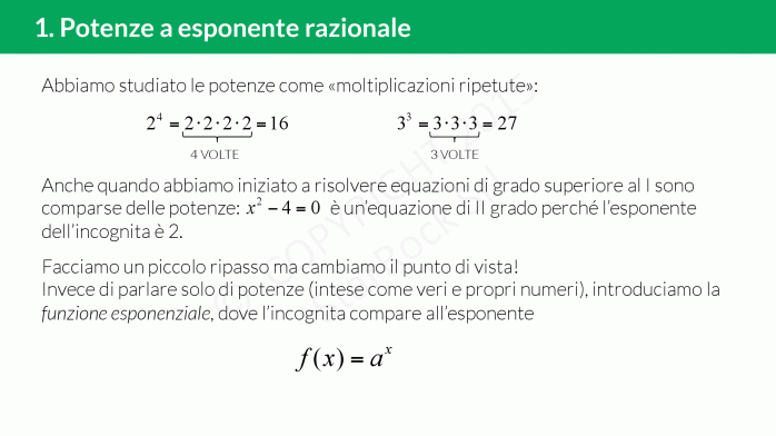 Ora però, invece di parlare solo di potenze (intese come veri e propri numeri), introduciamo la funzione esponenziale, dove l’incognita compare all’esponente £$f(x)=a^x$£.