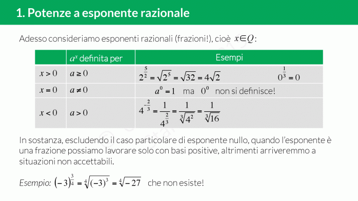 In sostanza, escludendo il caso particolare di esponente nullo, quando l’esponente è una frazione possiamo lavorare solo con basi positive, altrimenti arriveremmo a situazioni non accettabili.