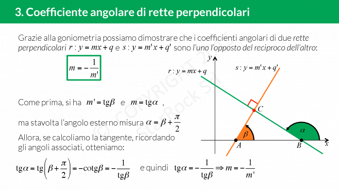 Per la dimostrazione del legame fra i coefficienti angolari di rette perpendicolari possiamo usare il calcolo dell’angolo tra due rette.