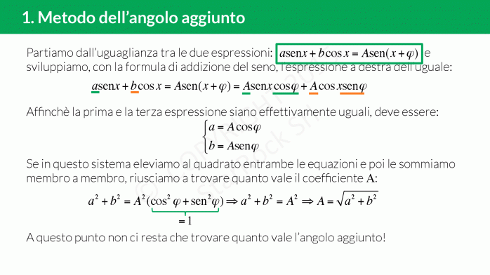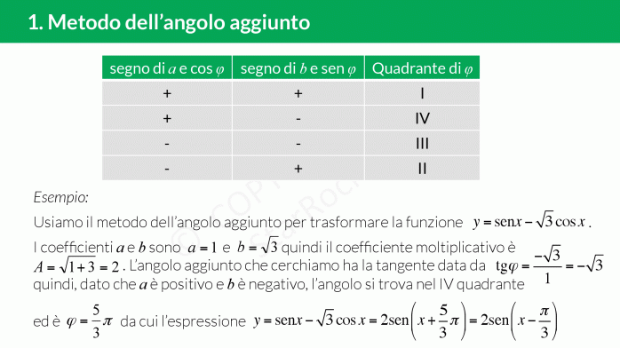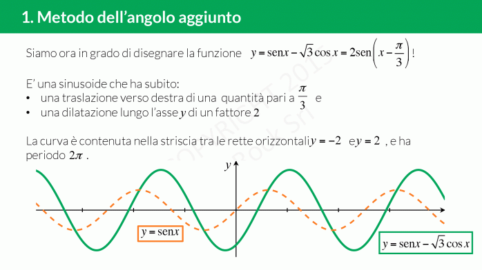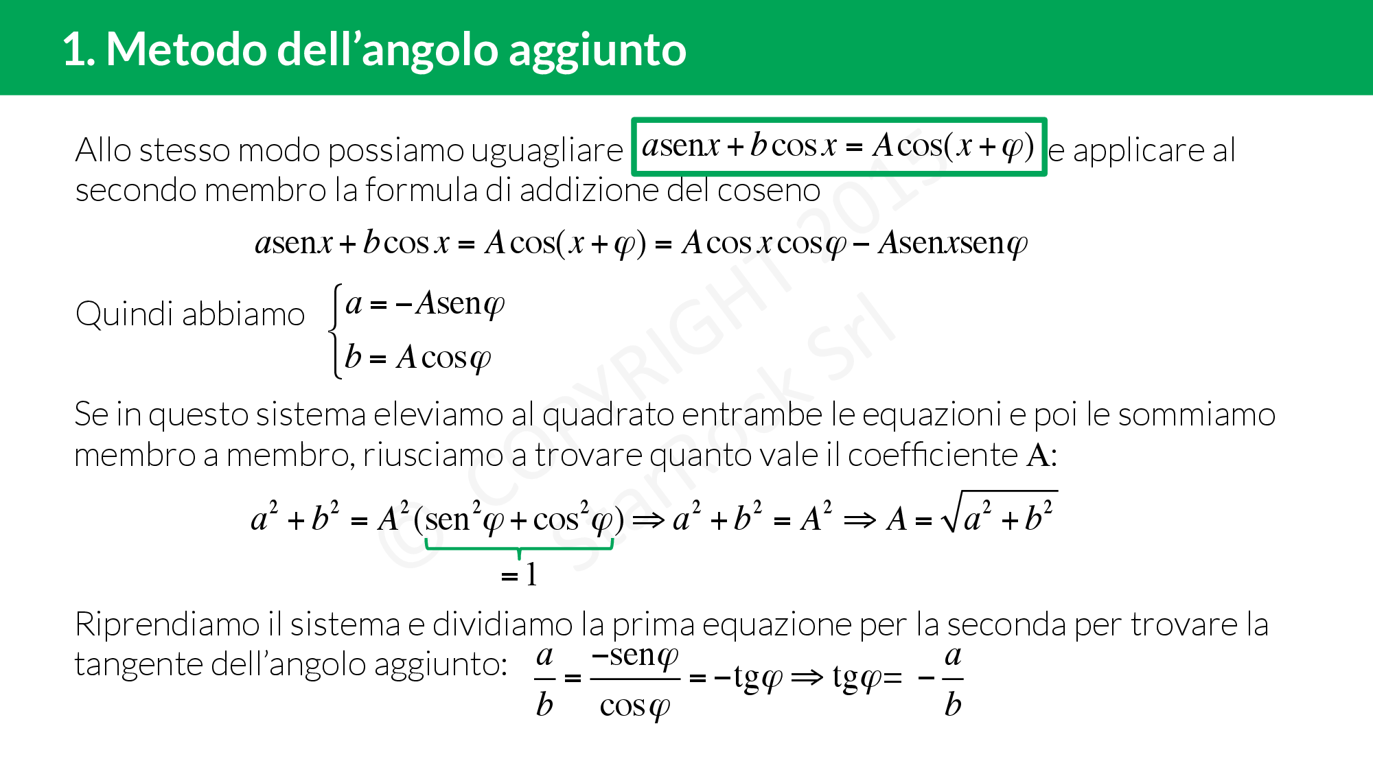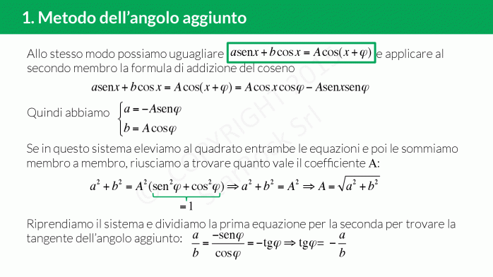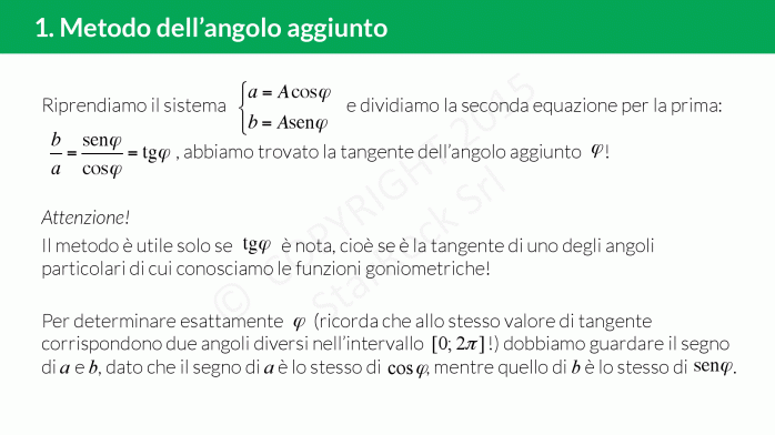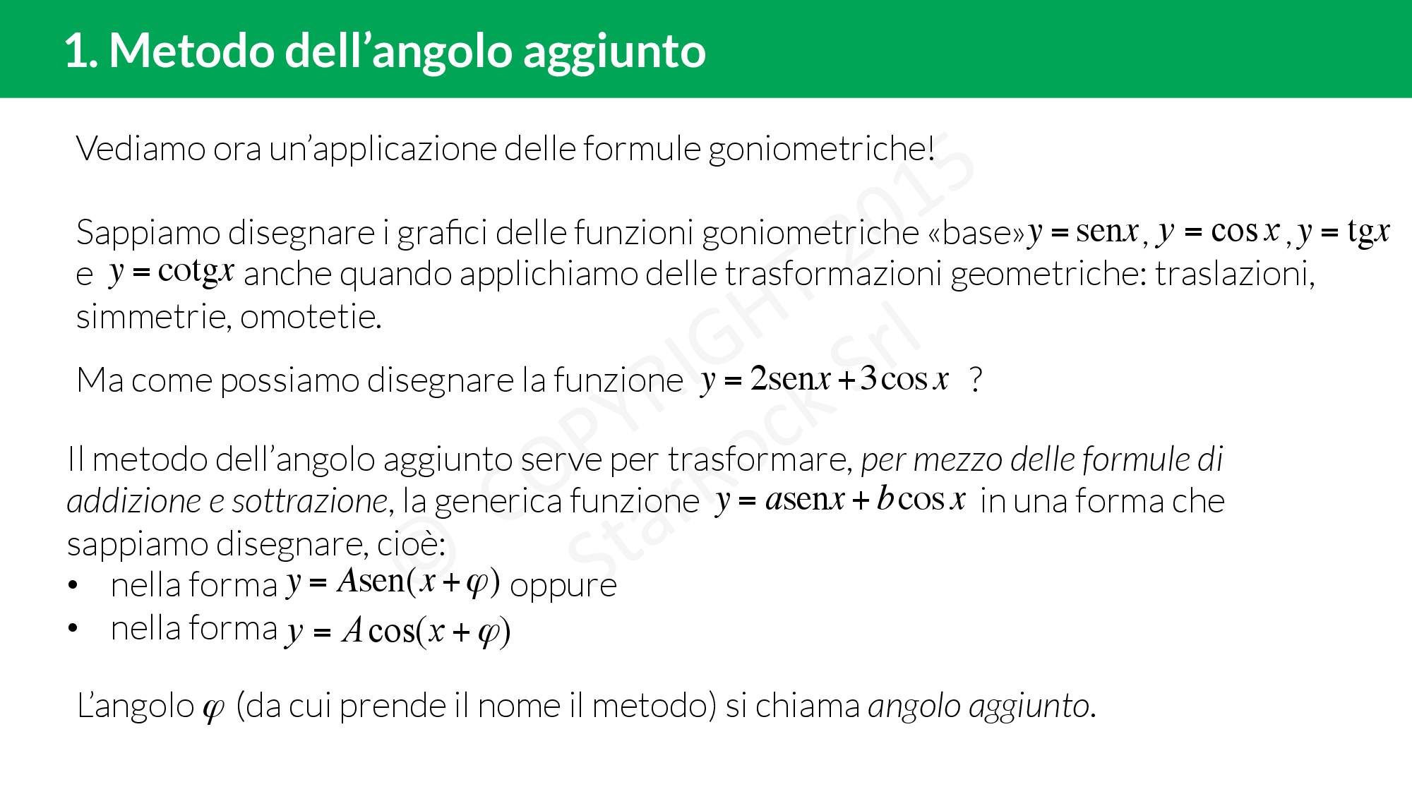 Il metodo dell’angolo aggiunto serve per trasformare, per mezzo delle formule di addizione e sottrazione, una funzione nella forma £$y=a \ sen \ x + b \ cos \ x $£ in una forma che sappiamo disegnare, cioè: