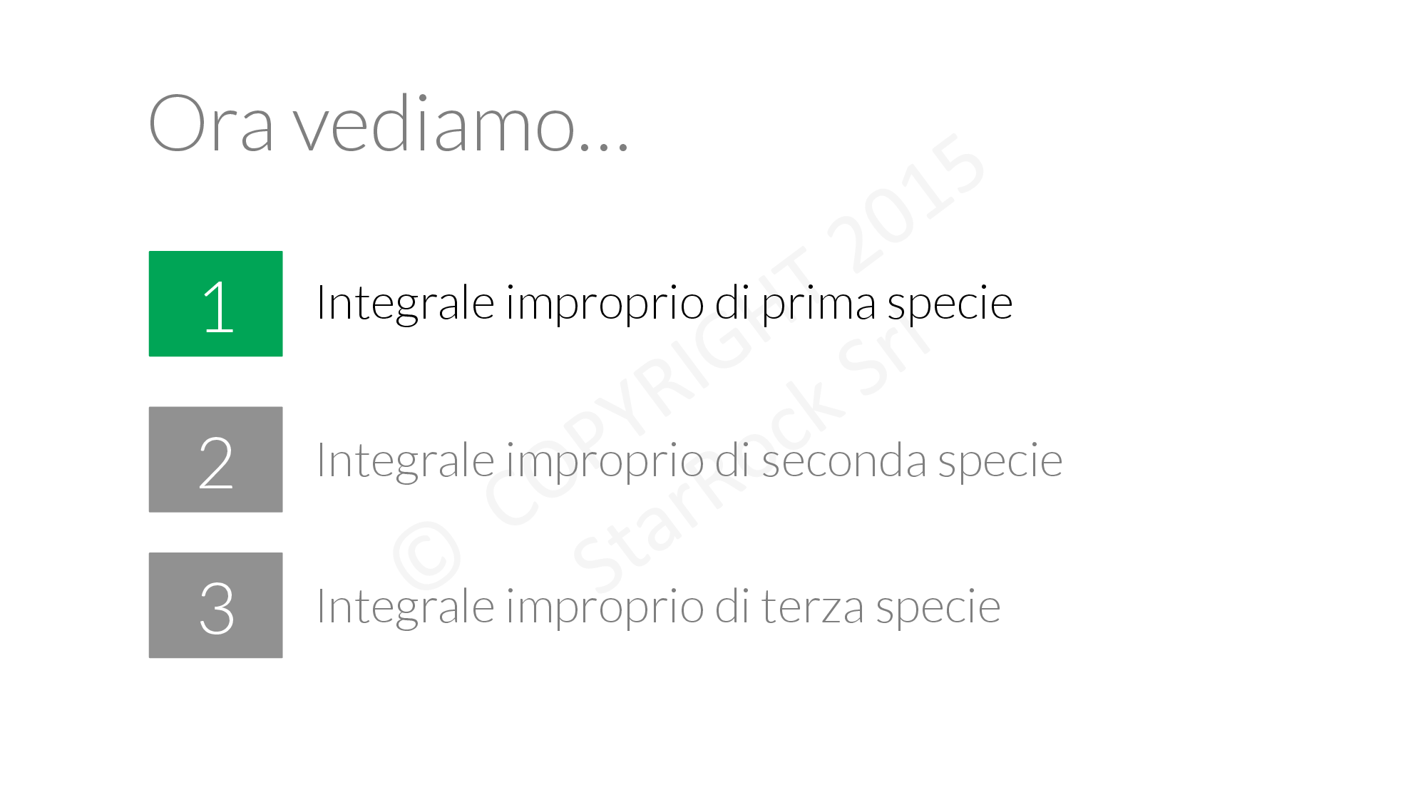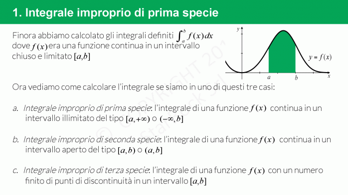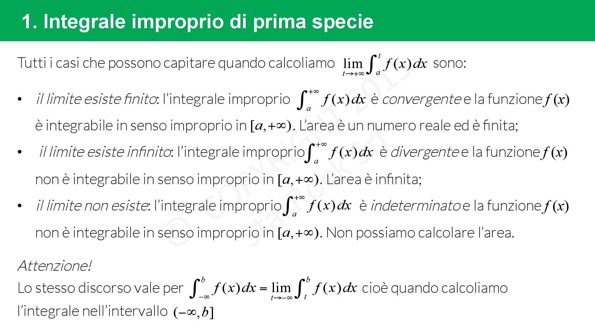 Gli integrali impropri sono di prima specie quando uno o entrambi gli estremi di integrazione sono infiniti.