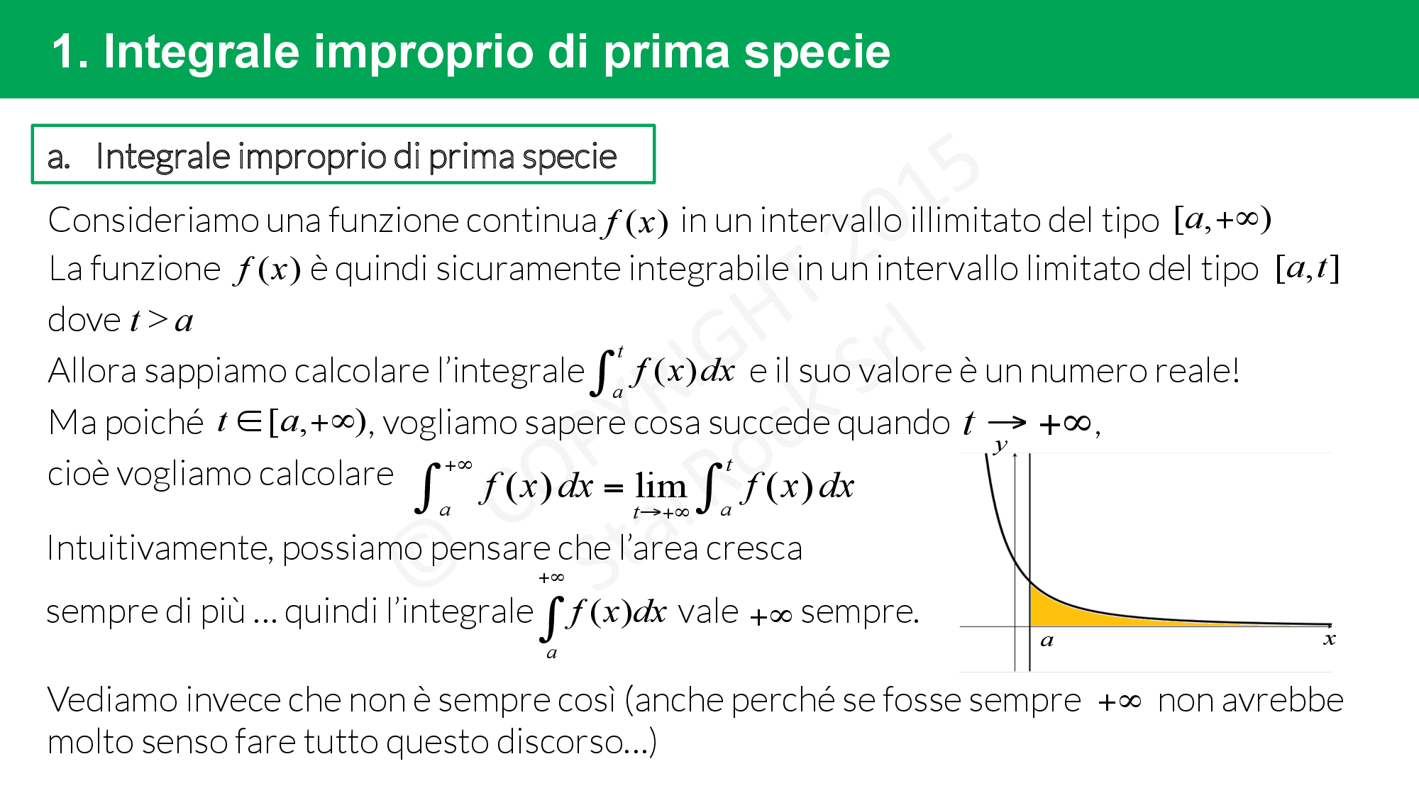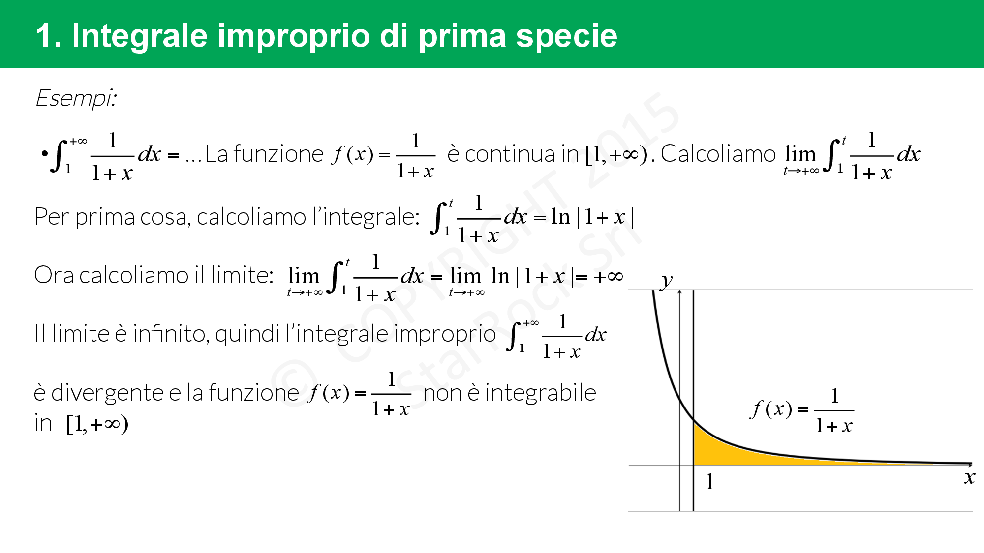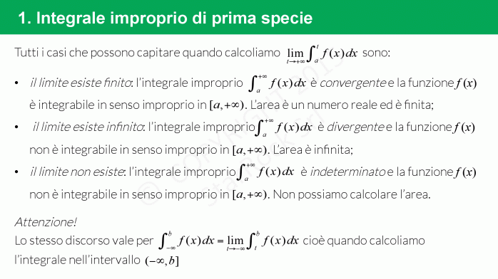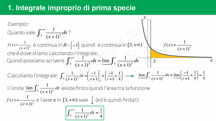- esista finito, allora l’integrale è convergente e la funzione è integrabile in senso improprio. L’integrale rappresenta un’area finita;