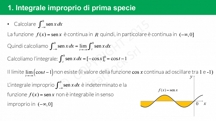 - non esista, allora l’integrale è indeterminato e la funzione non è integrabile in senso improprio. Non possiamo calcolare l’area.