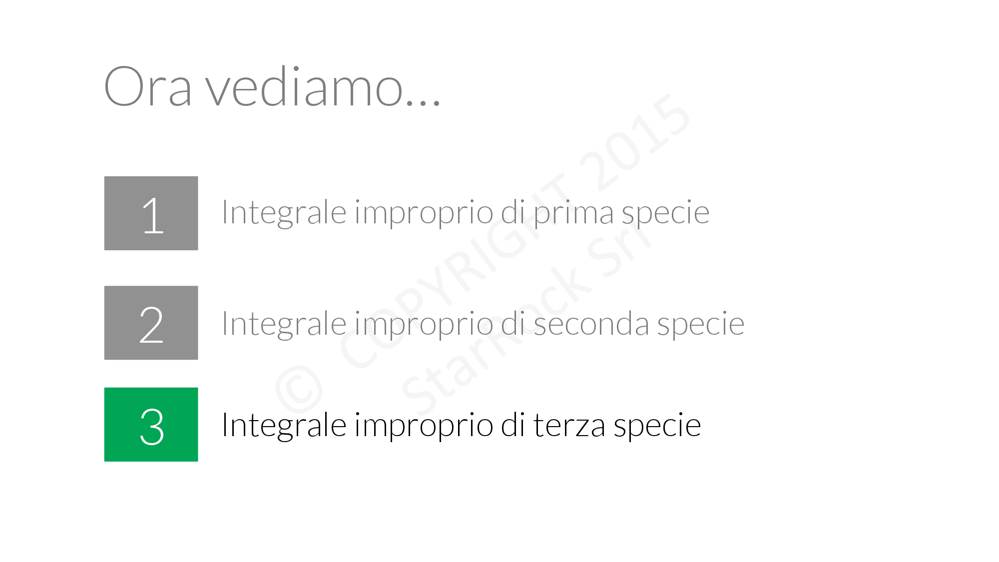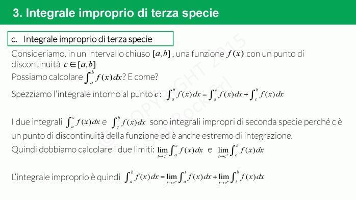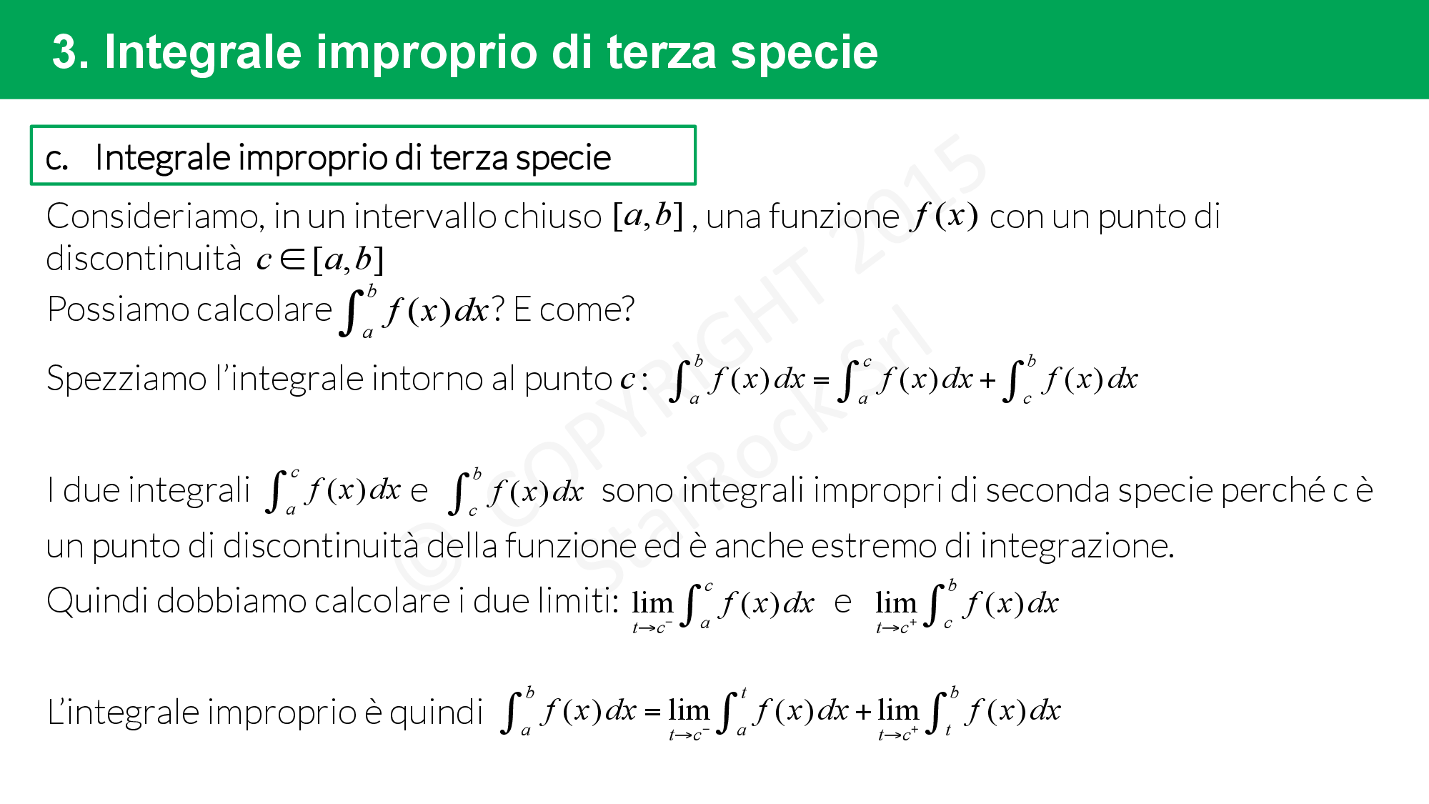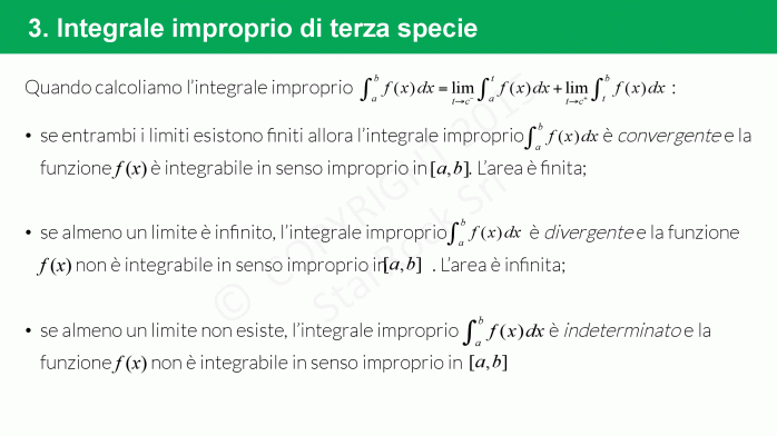 Gli integrali impropri sono di terza specie quando nell’intervallo di integrazione c’è un punto di discontinuità per la funzione.