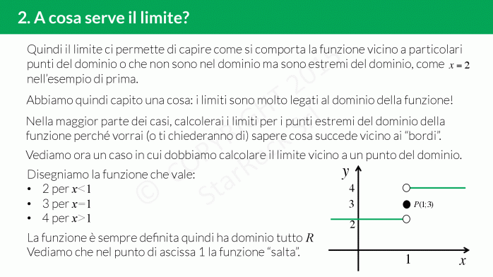 Si ma a cosa serve il calcolo di limiti? Il limite serve per capire come si comporta, quindi quali valori assume una funzione vicino a particolari punti del dominio o che non sono nel domino ma sono estremi del dominio. Quindi i limiti, in generale, sono legati al dominio della funzione.