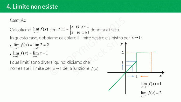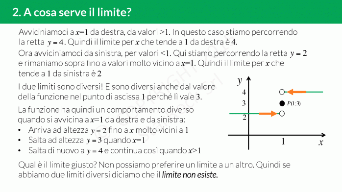 Ma cosa significa che il limite esiste? Quando ci avviciniamo a un punto, possiamo farlo da valori più grandi (cioè da destra) o da valori più piccoli (o da sinistra). Se avvicinandosi da entrambi i lati, i valori che assume la funzione sono uguali, allora diciamo che il limite esiste. Altrimenti diciamo che il limite non esiste.